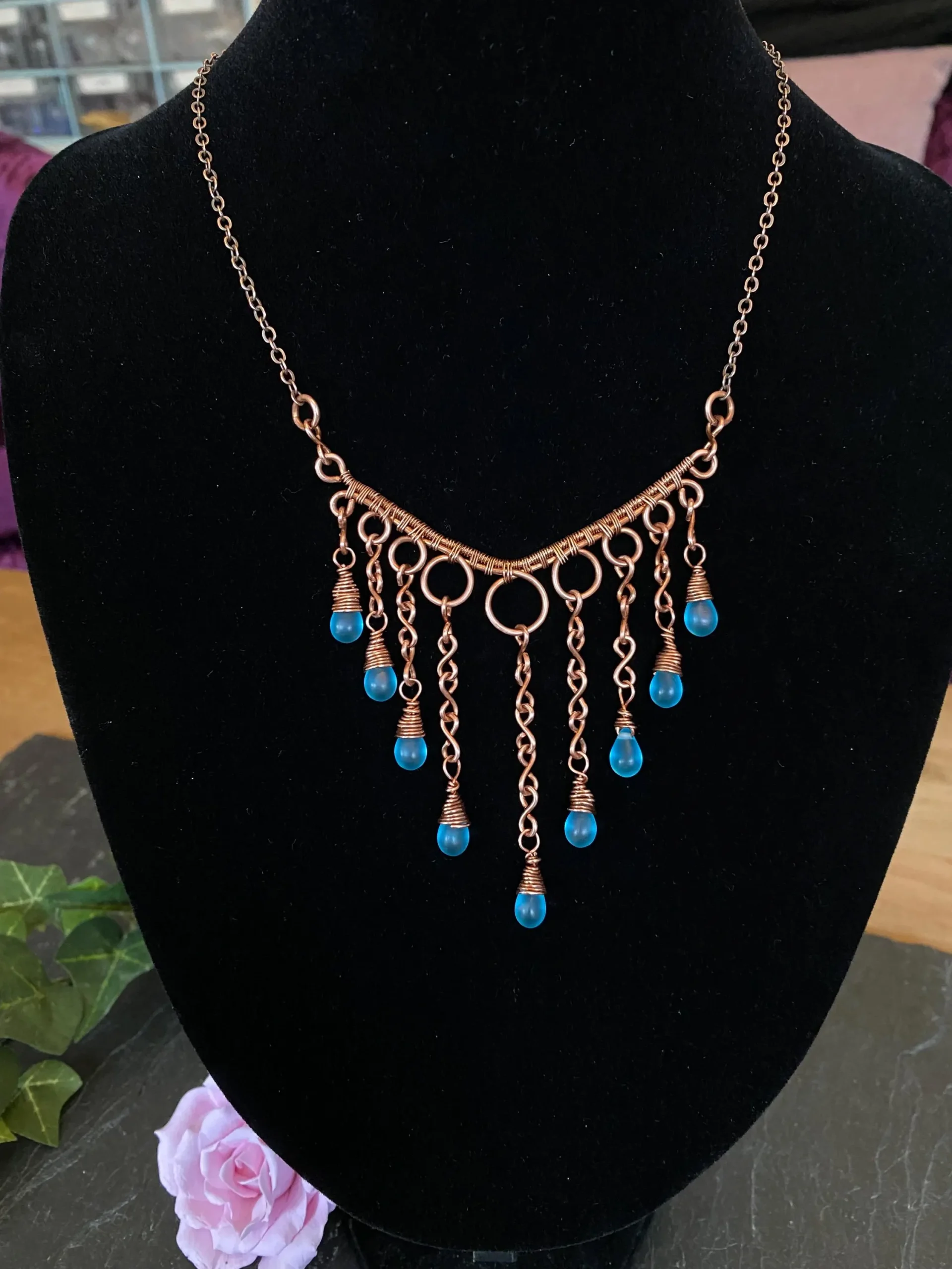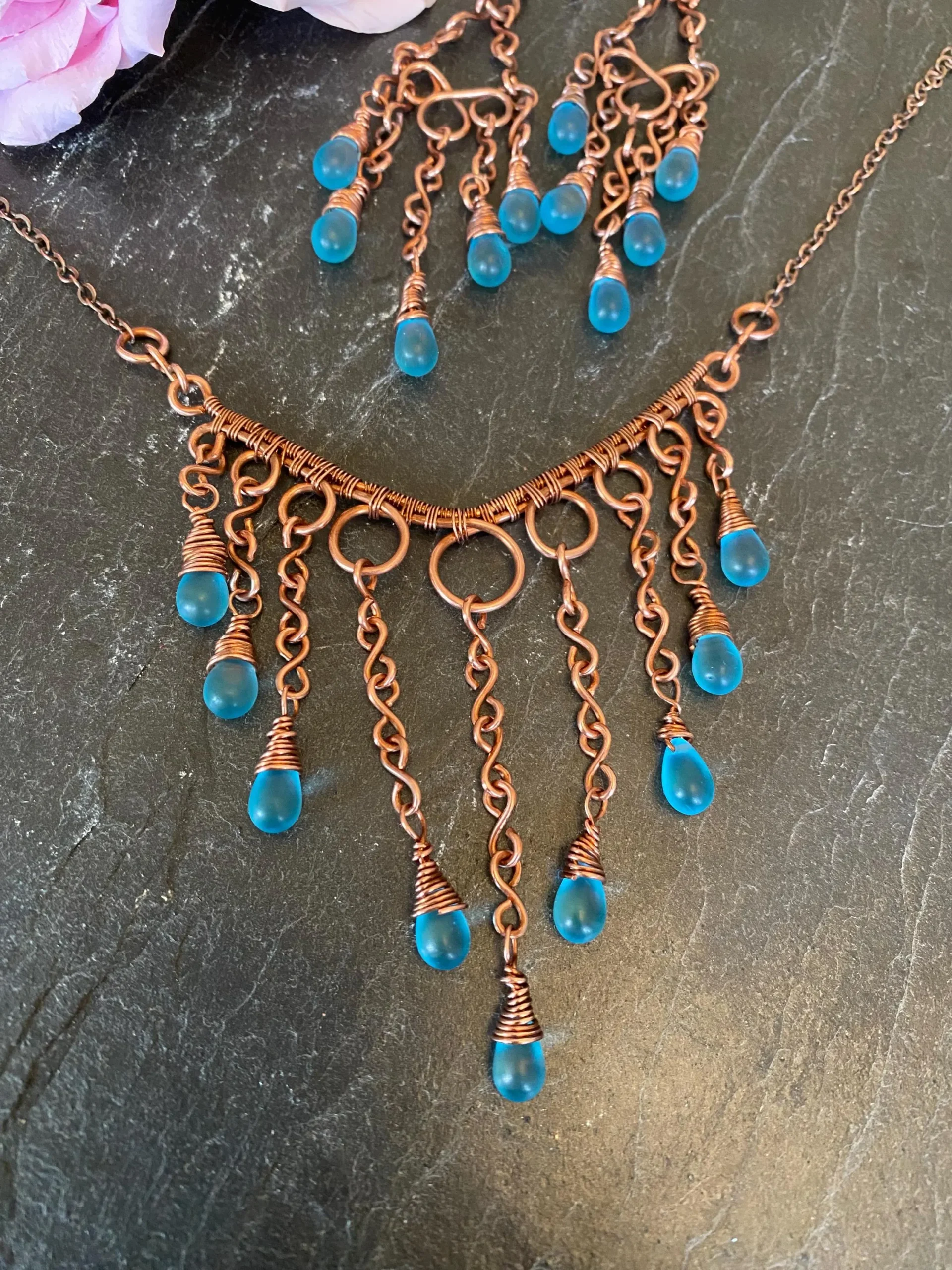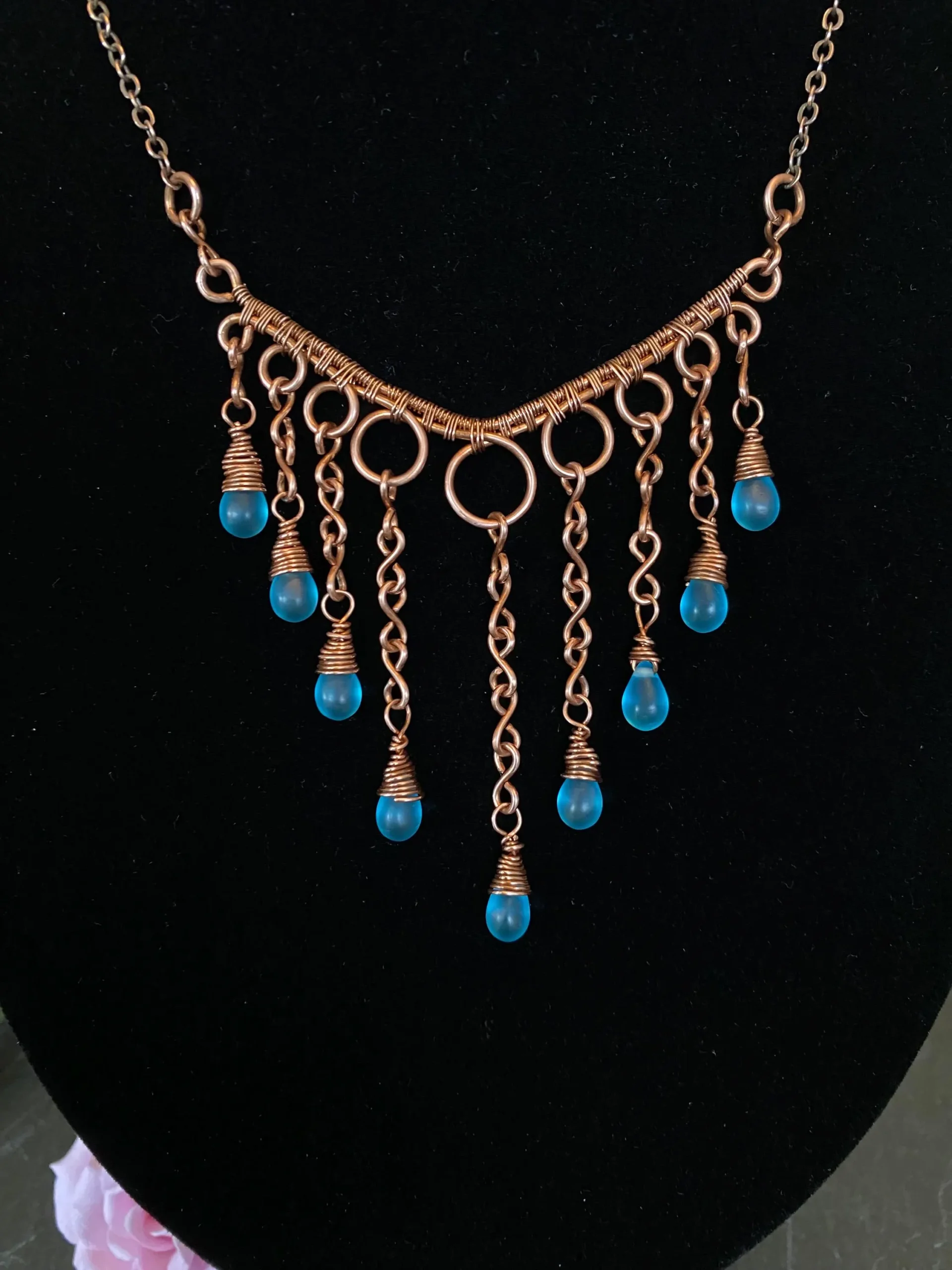 This copper waterfall necklace is a beautiful piece of handcrafted jewelry. I carefully wove pure copper wire into a delicate waterfall design and added shimmering blue glass teardrop beads that catch the light. As a result, the necklace looks elegant and fits perfectly with both casual and formal outfits.
