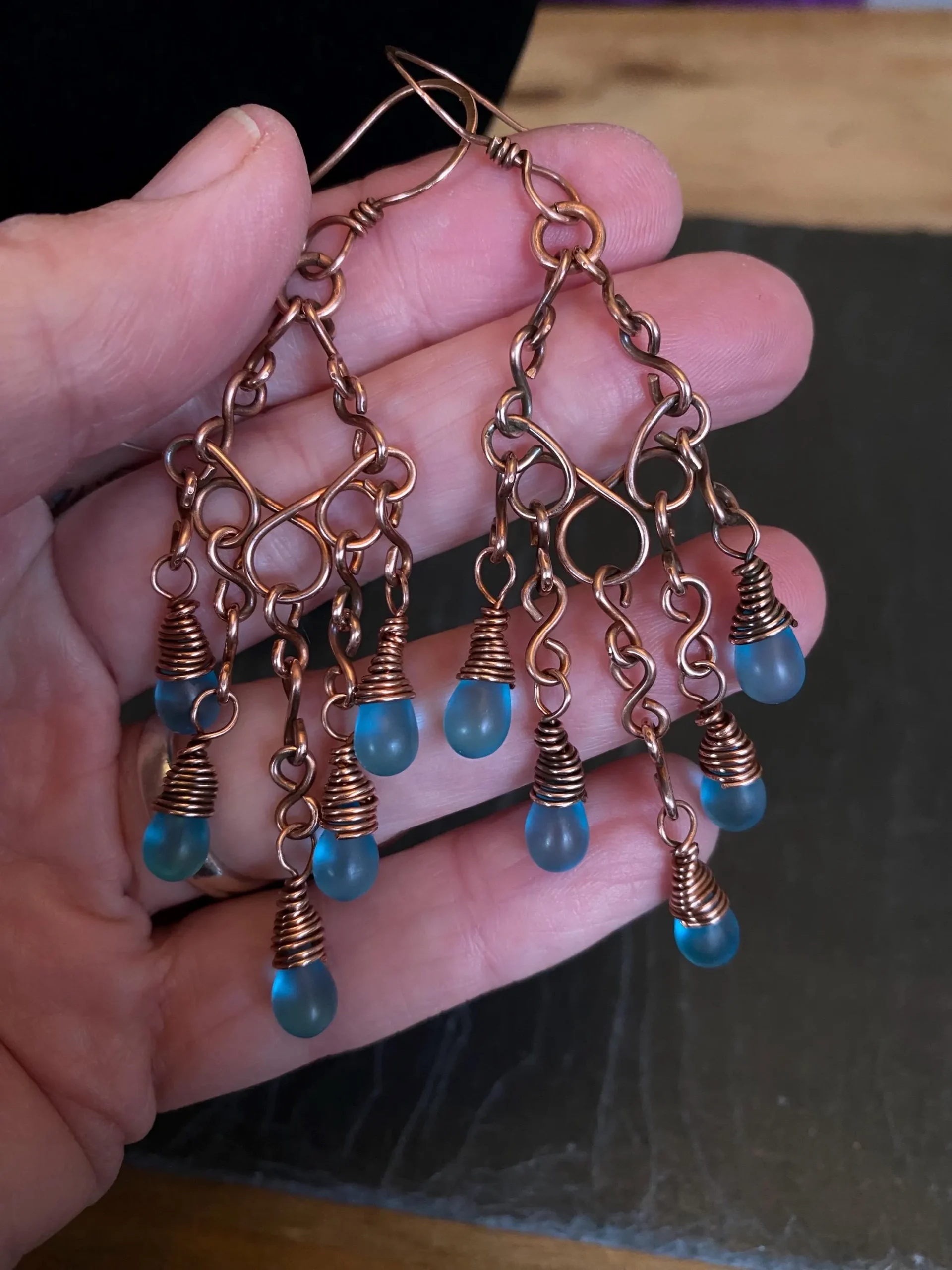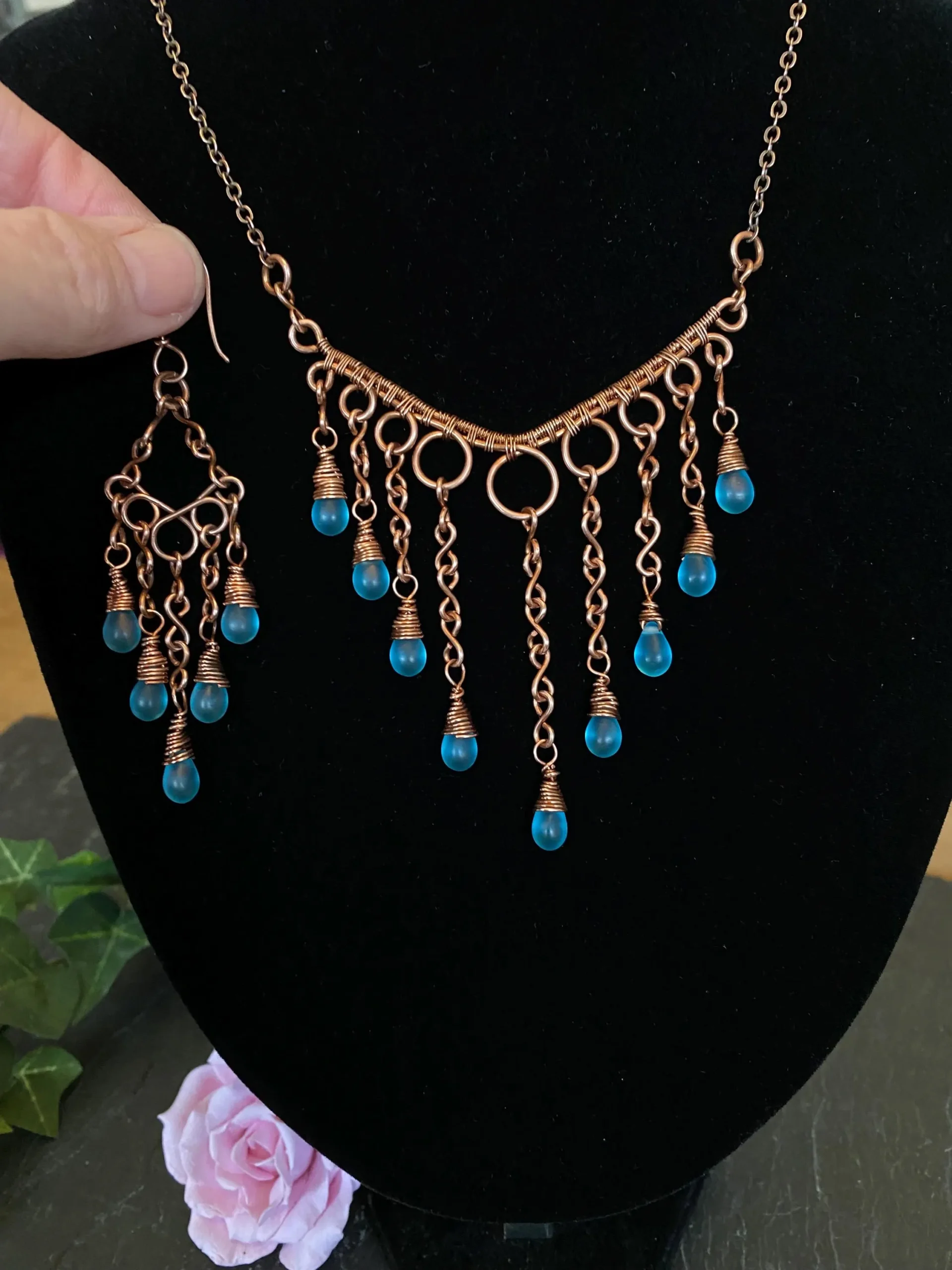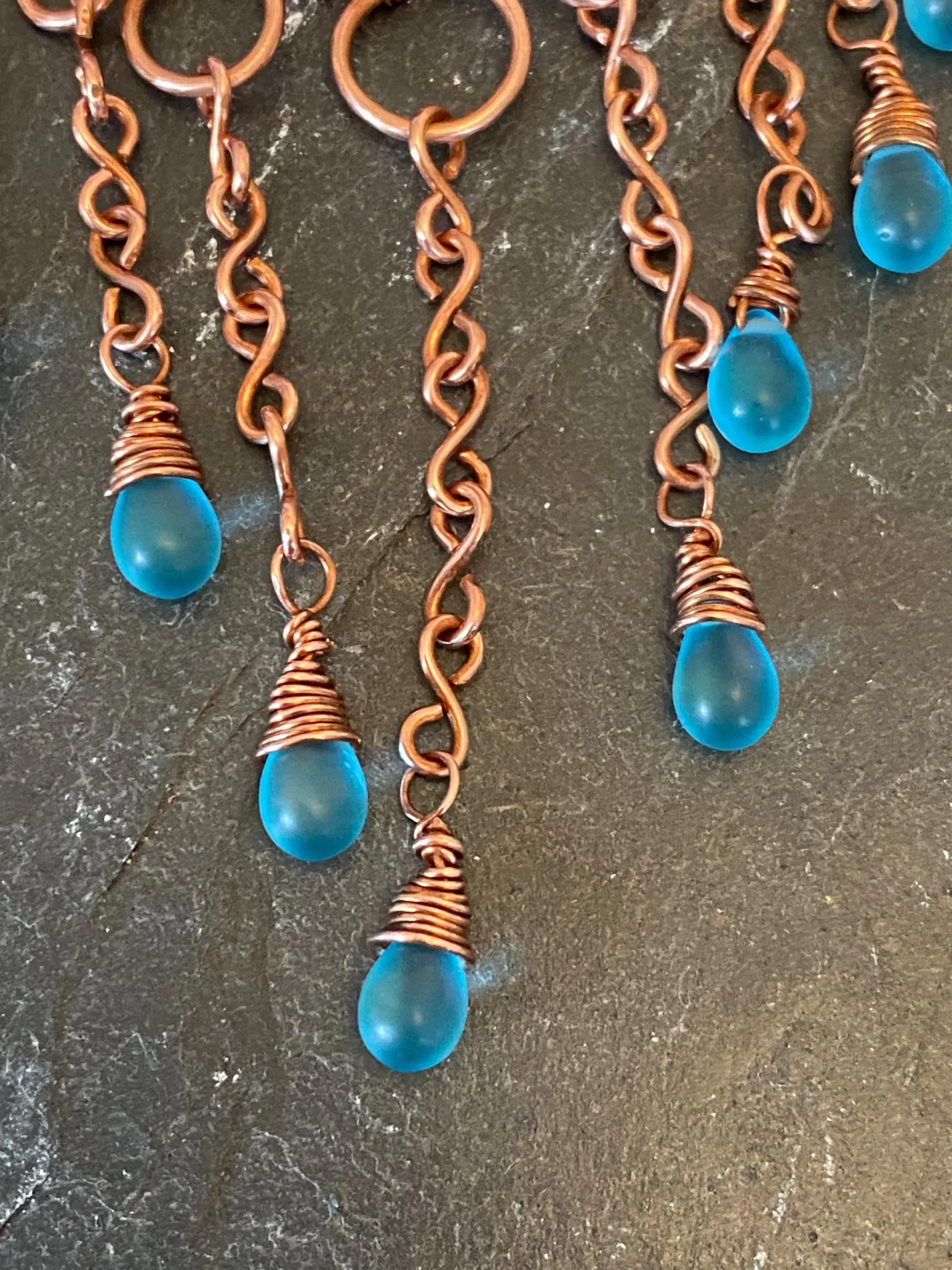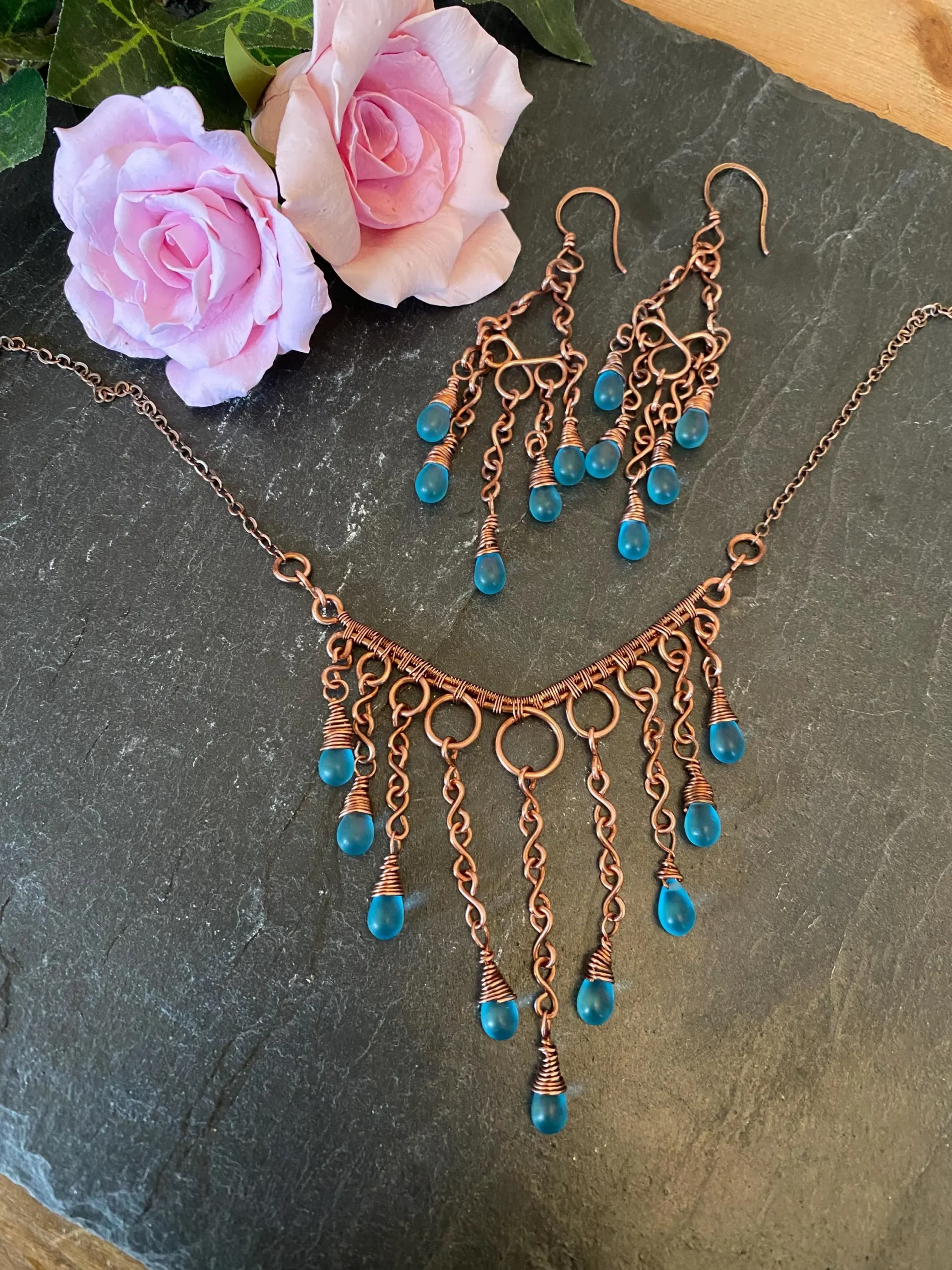 This copper waterfall necklace is a beautiful piece of handcrafted jewelry. I carefully wove pure copper wire into a delicate waterfall design and added shimmering blue glass teardrop beads that catch the light. As a result, the necklace looks elegant and fits perfectly with both casual and formal outfits.