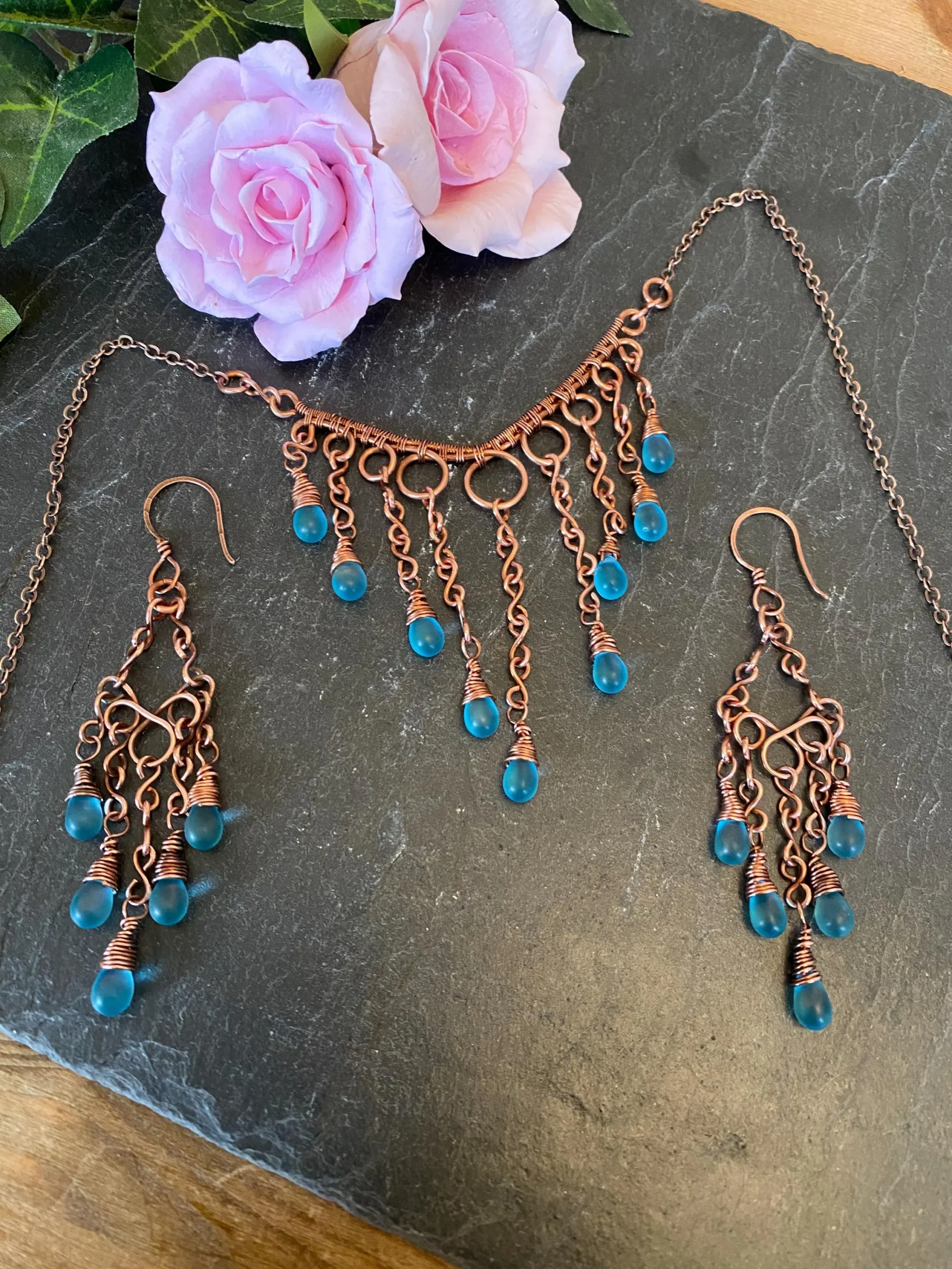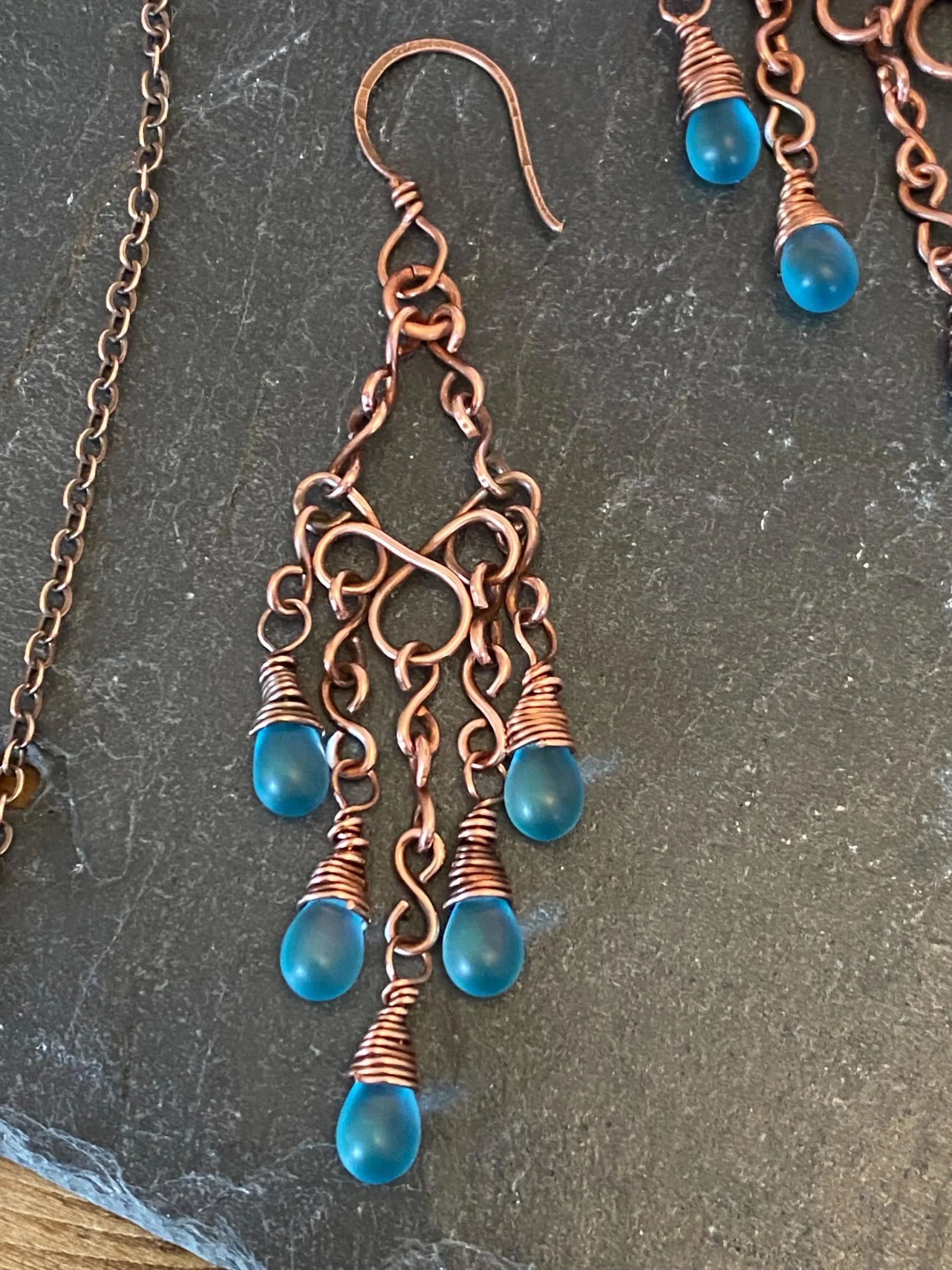 Bare Copper Wire and blue glass tear drop dangle necklace with matching copper earrings