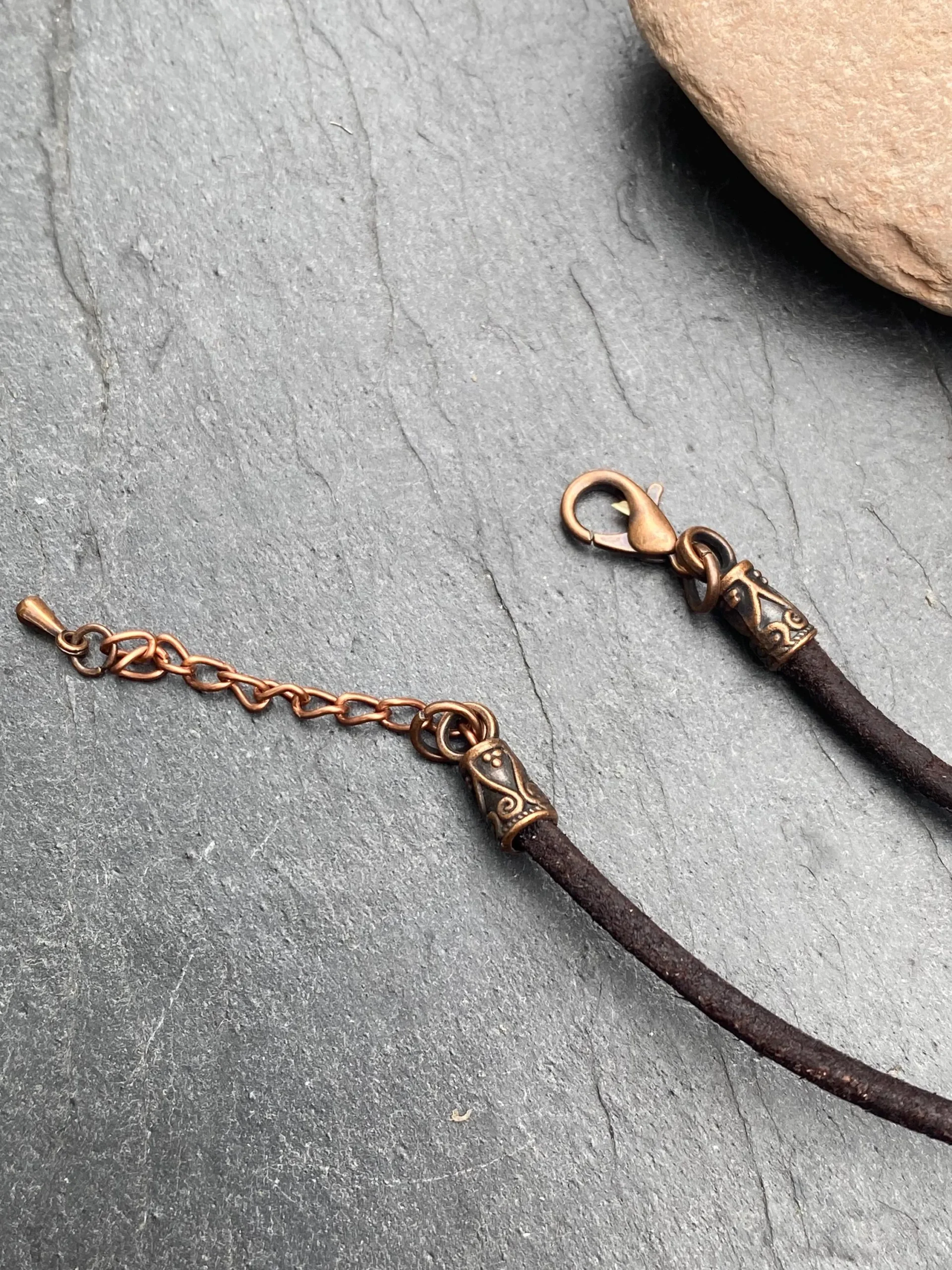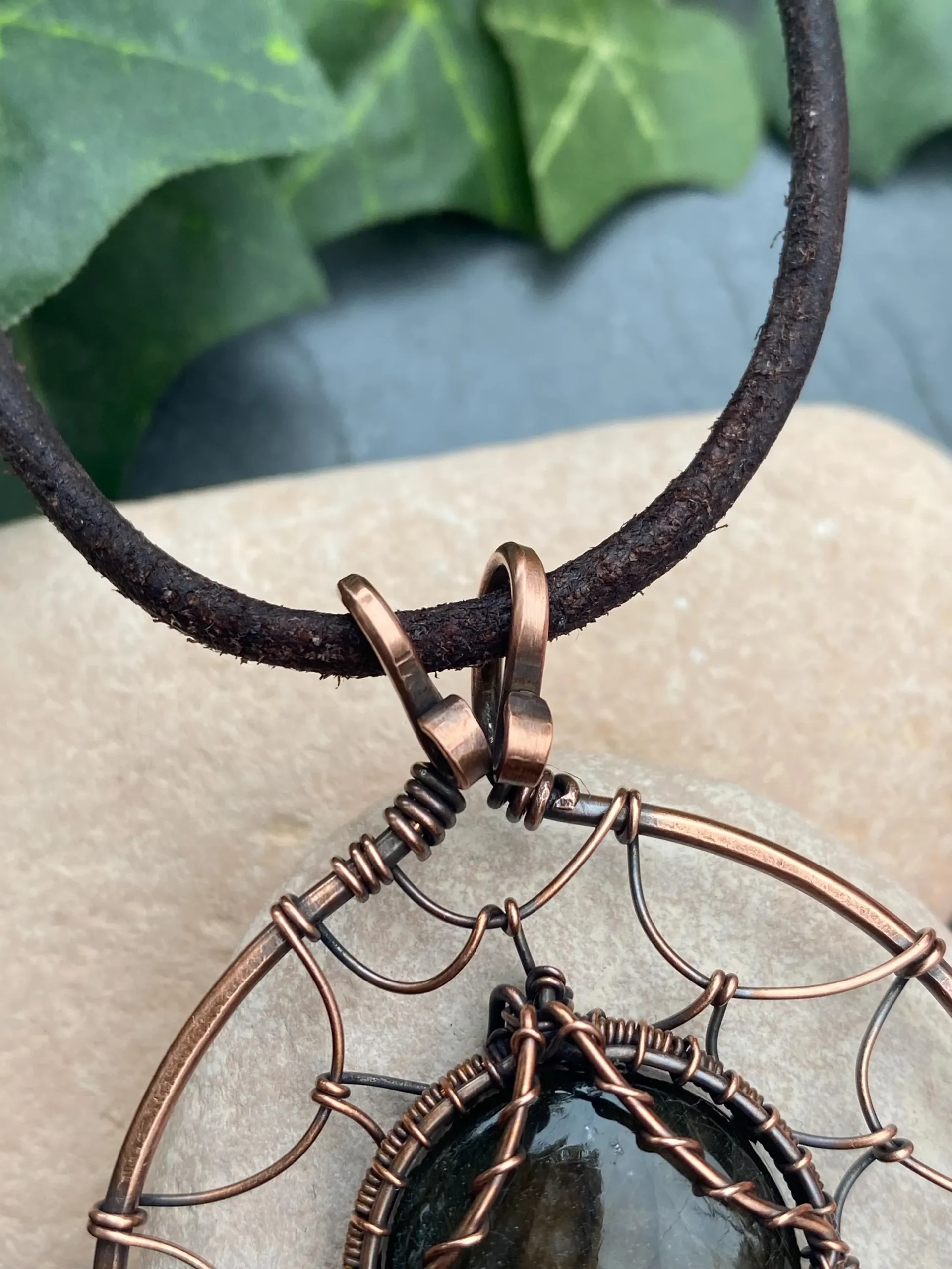 Every Blue Crystal Dreamcatcher Pendant is handmade, so each one is unique. The warm copper wire creates a rich contrast against the vivid blue stone, while the woven design highlights traditional wire art techniques. A soft suede cord is included so you can wear it right away.