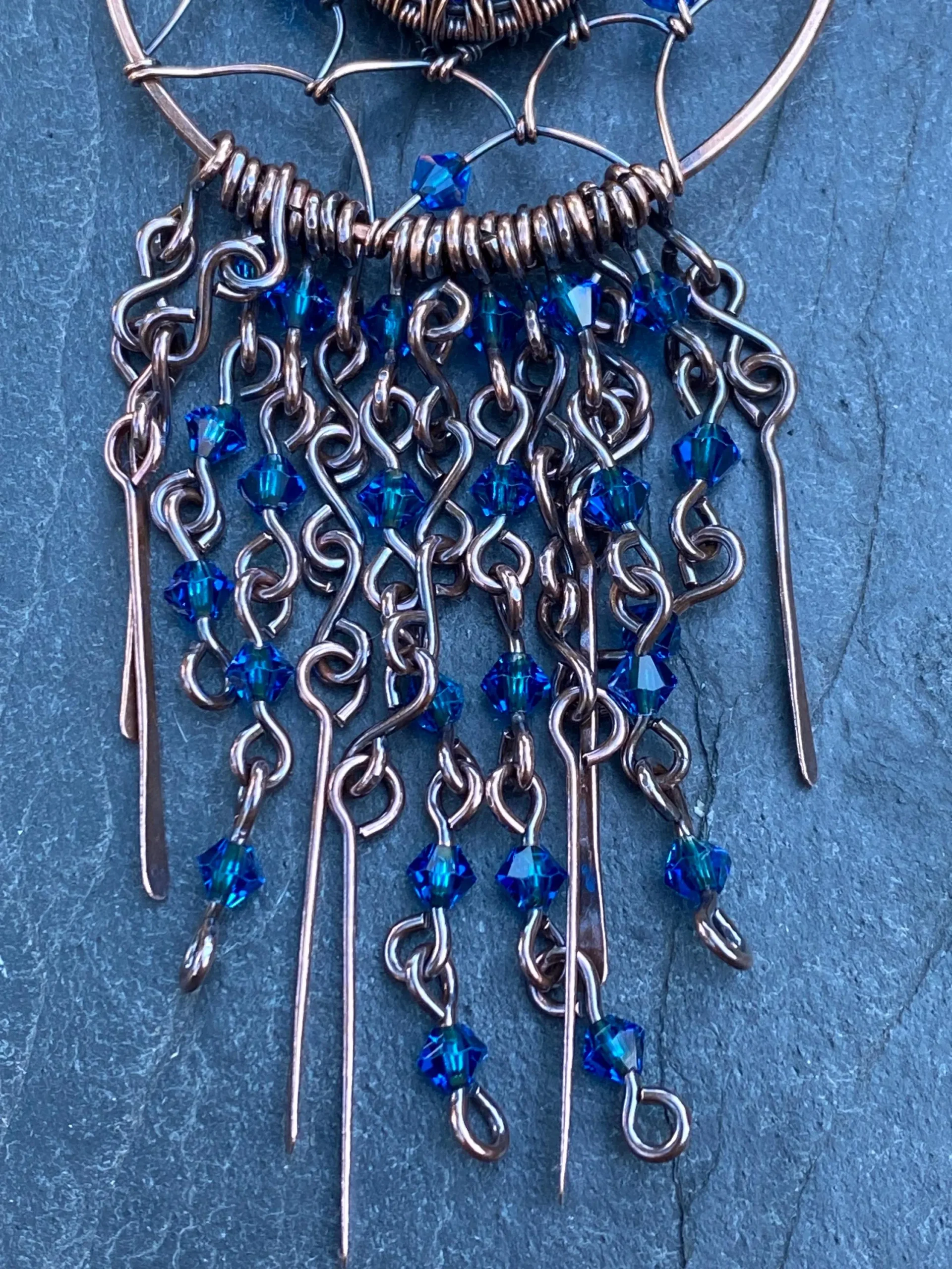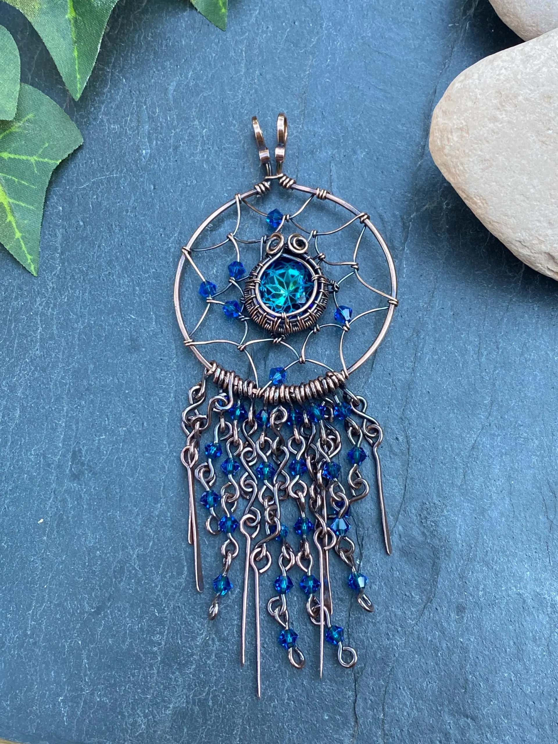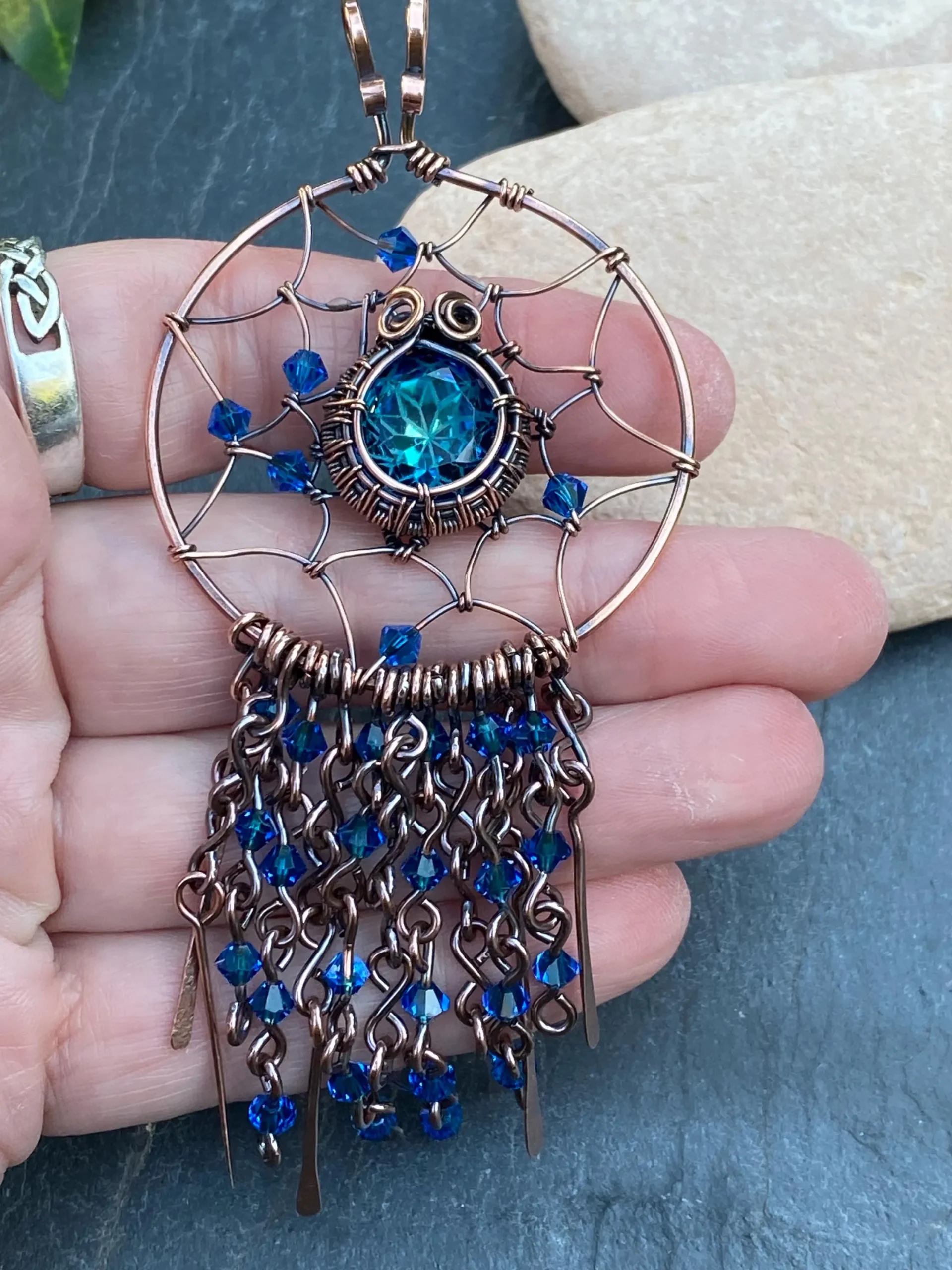 Blue Crystal Dreamcatcher Pendant – Copper Wire Wrapped Jewelry with Crystals