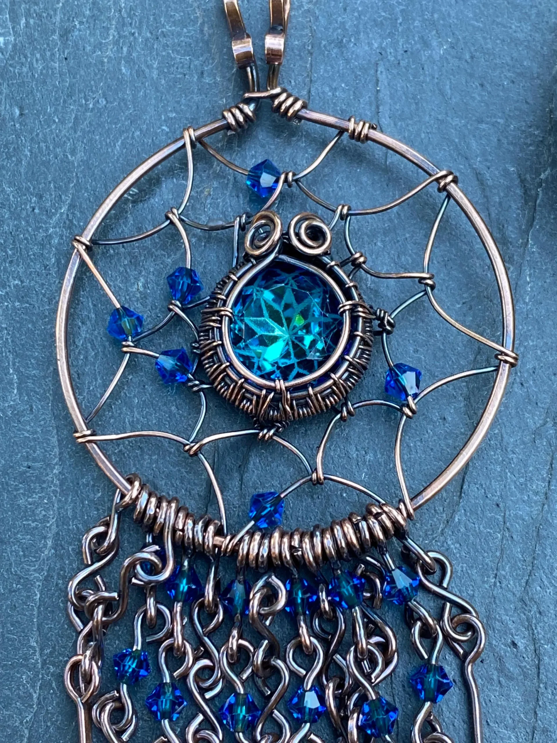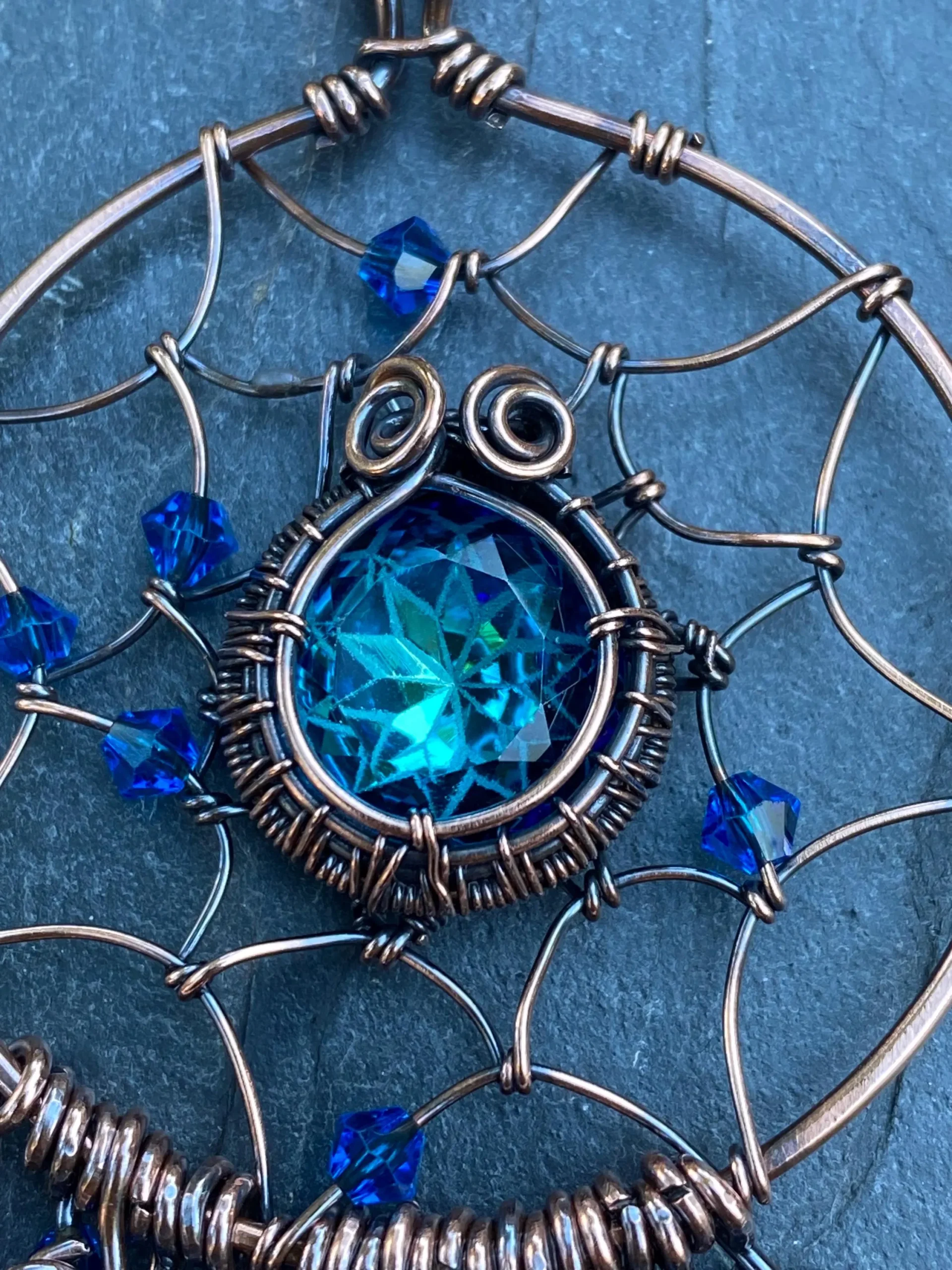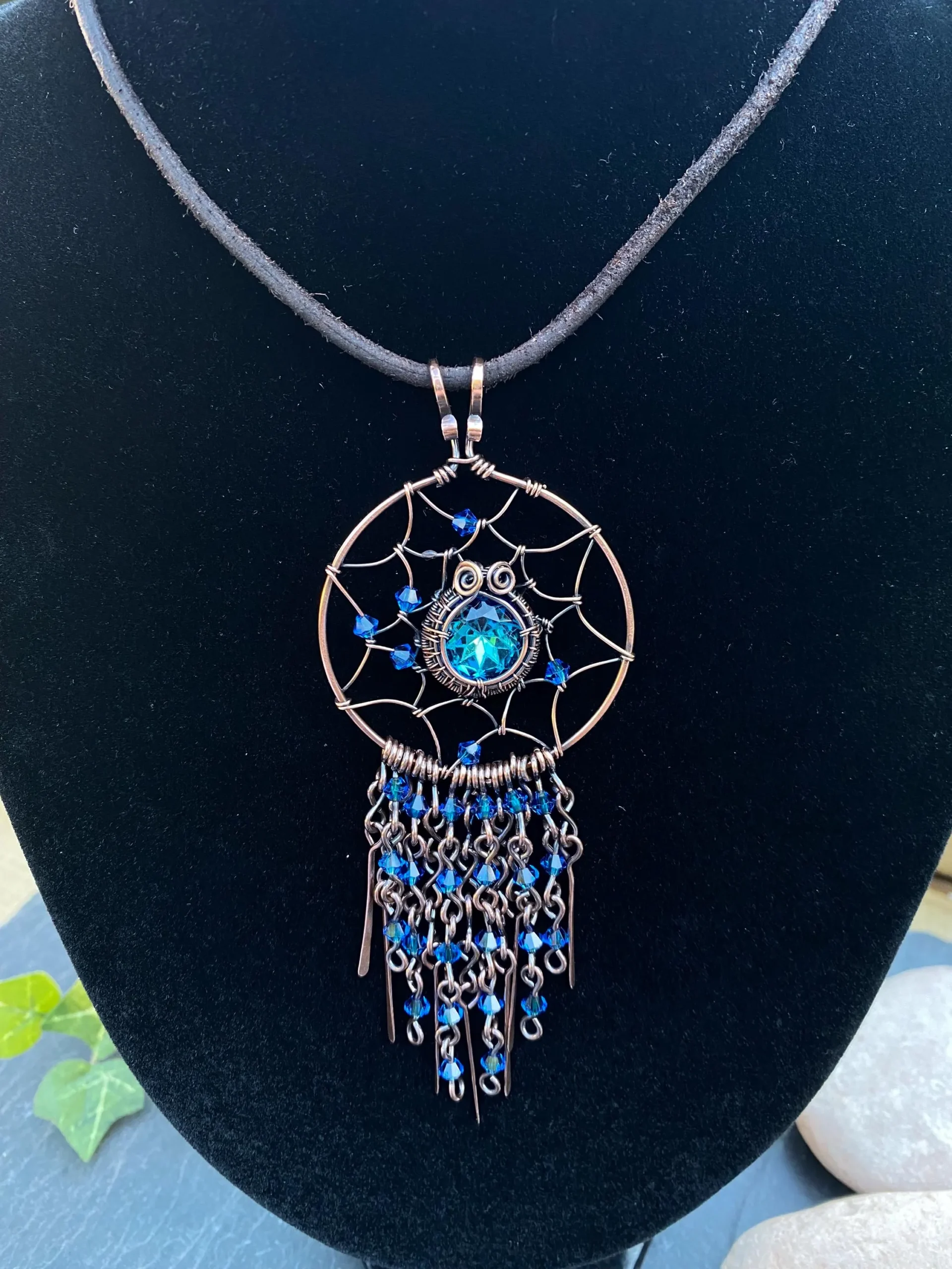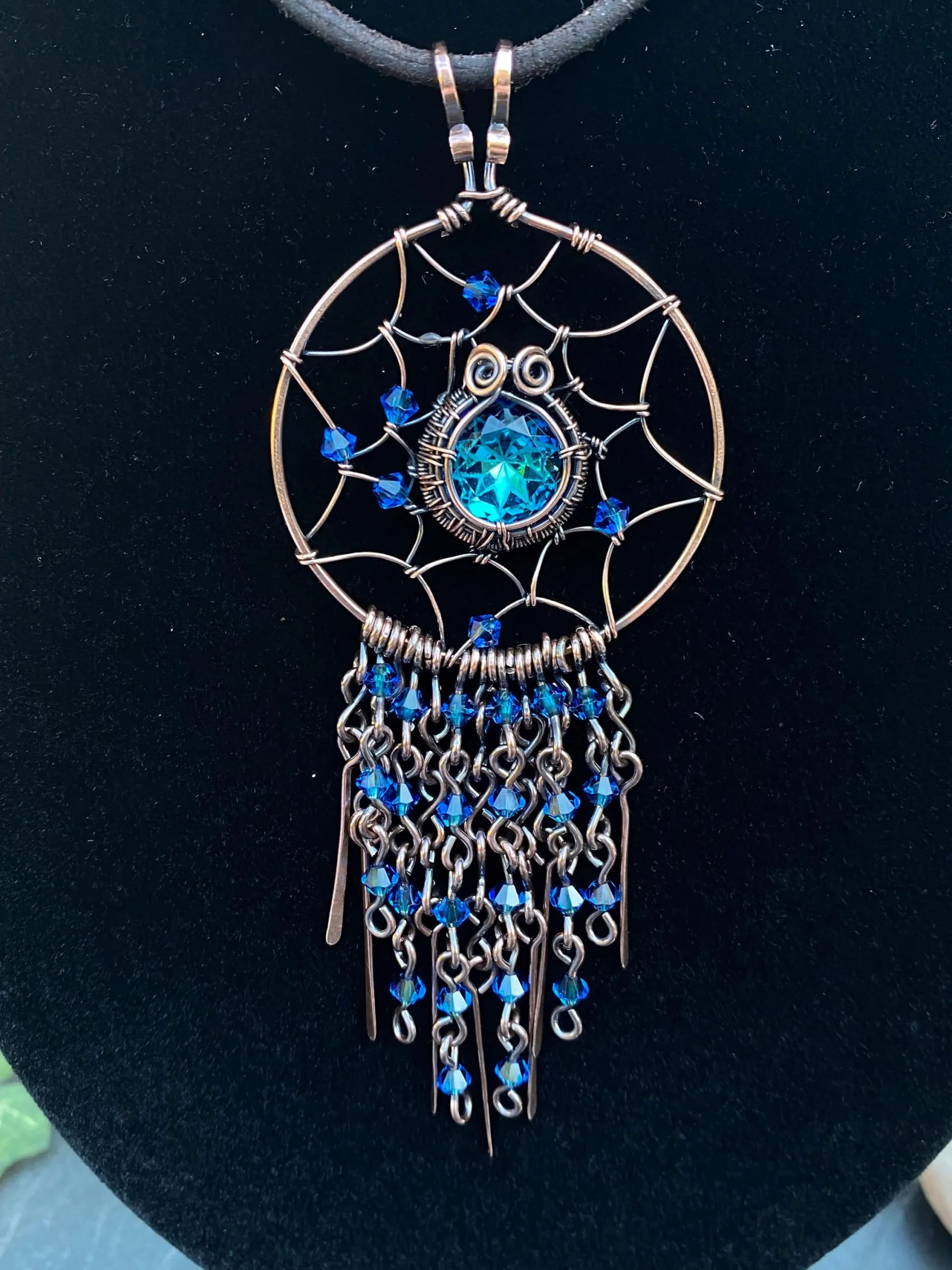 Blue Crystal Dreamcatcher Pendant – Copper Wire Wrapped Jewelry with Crystals