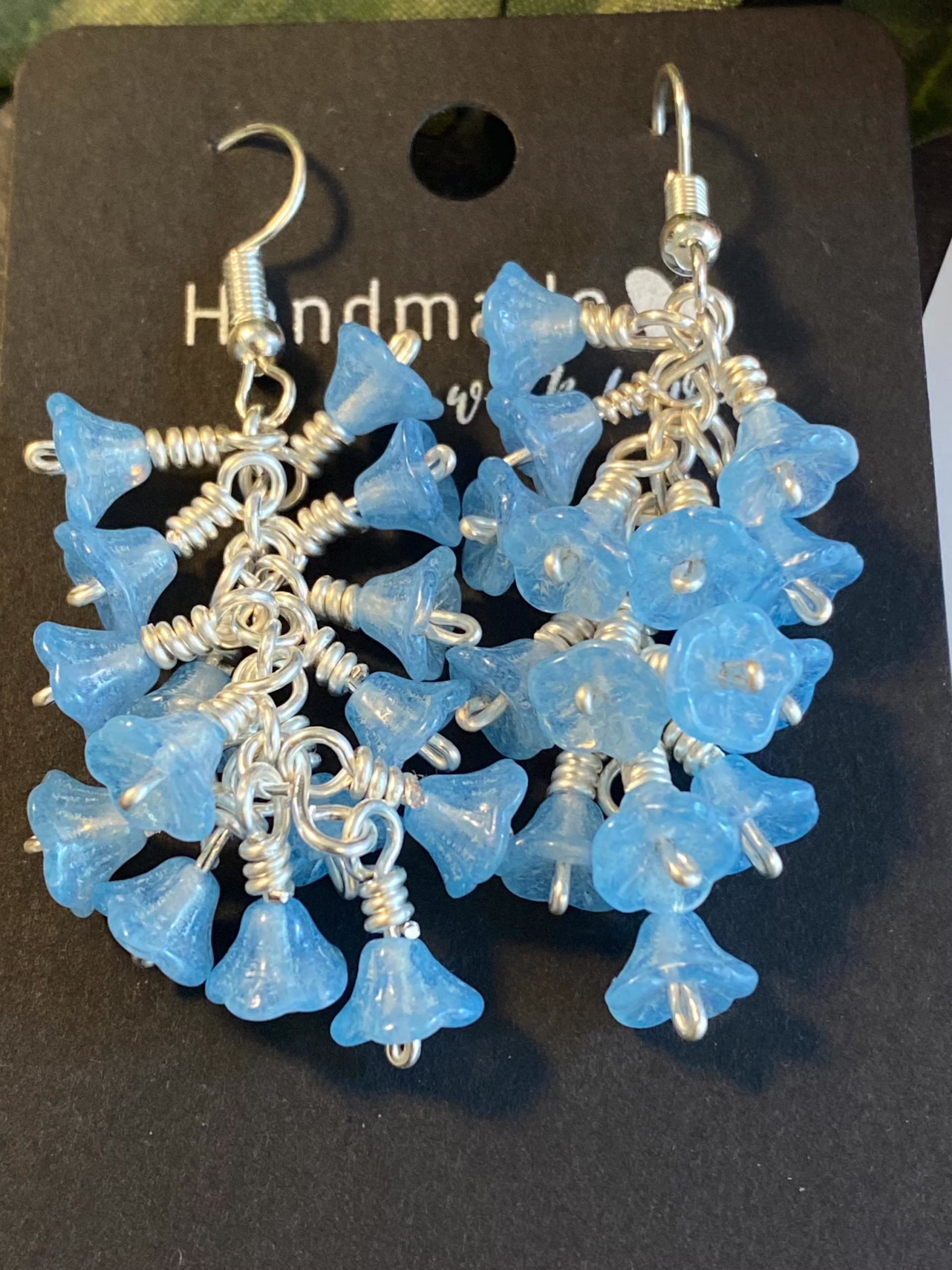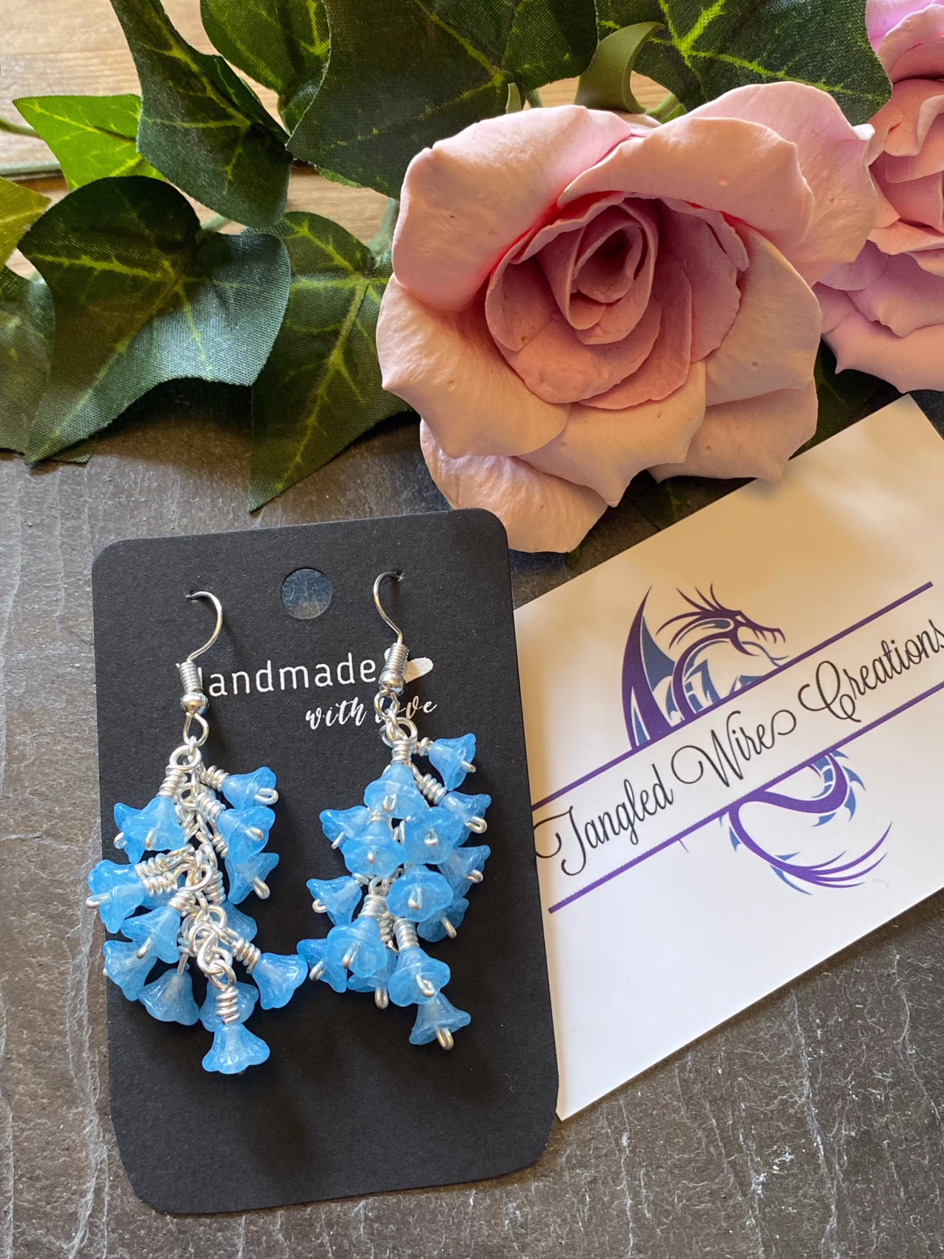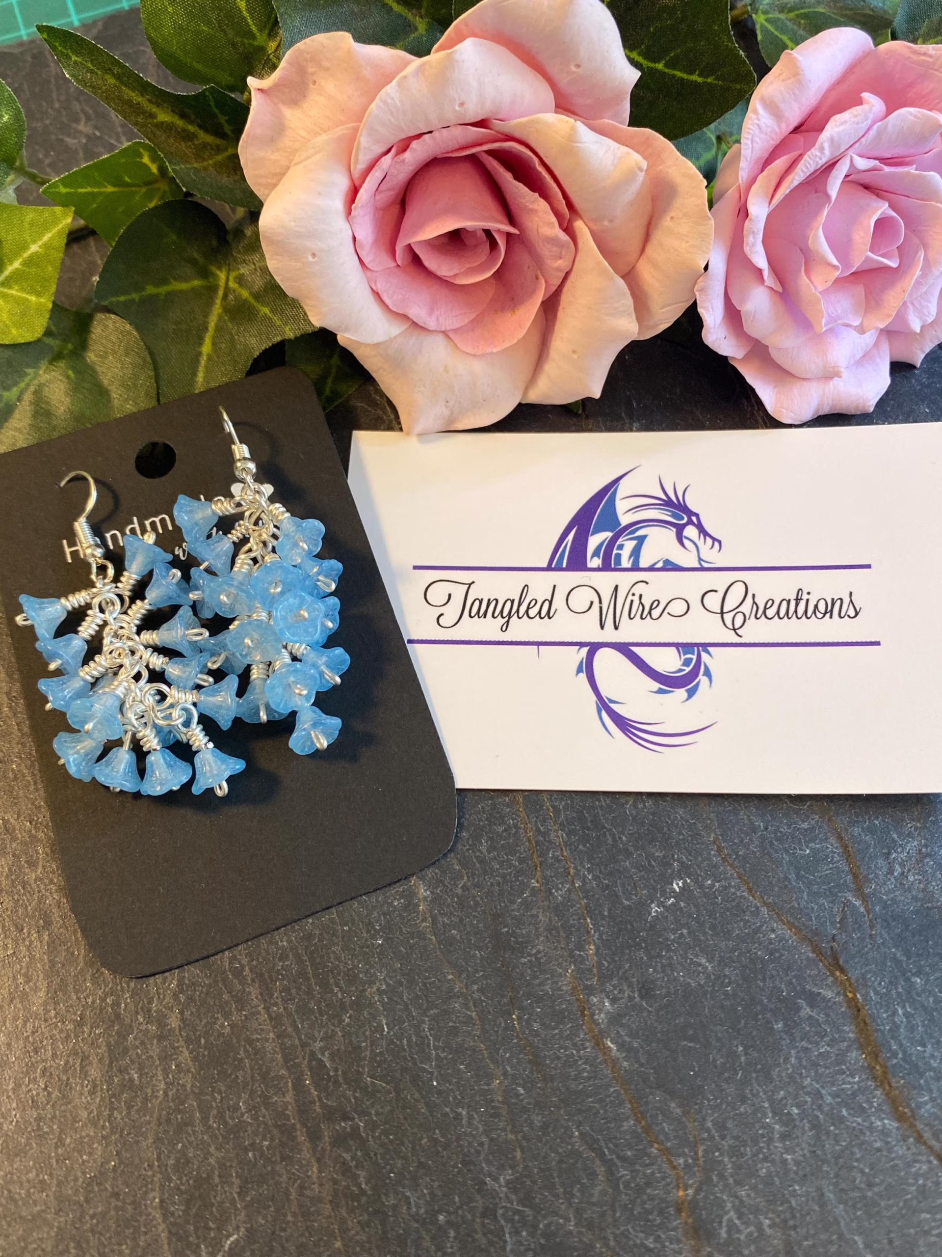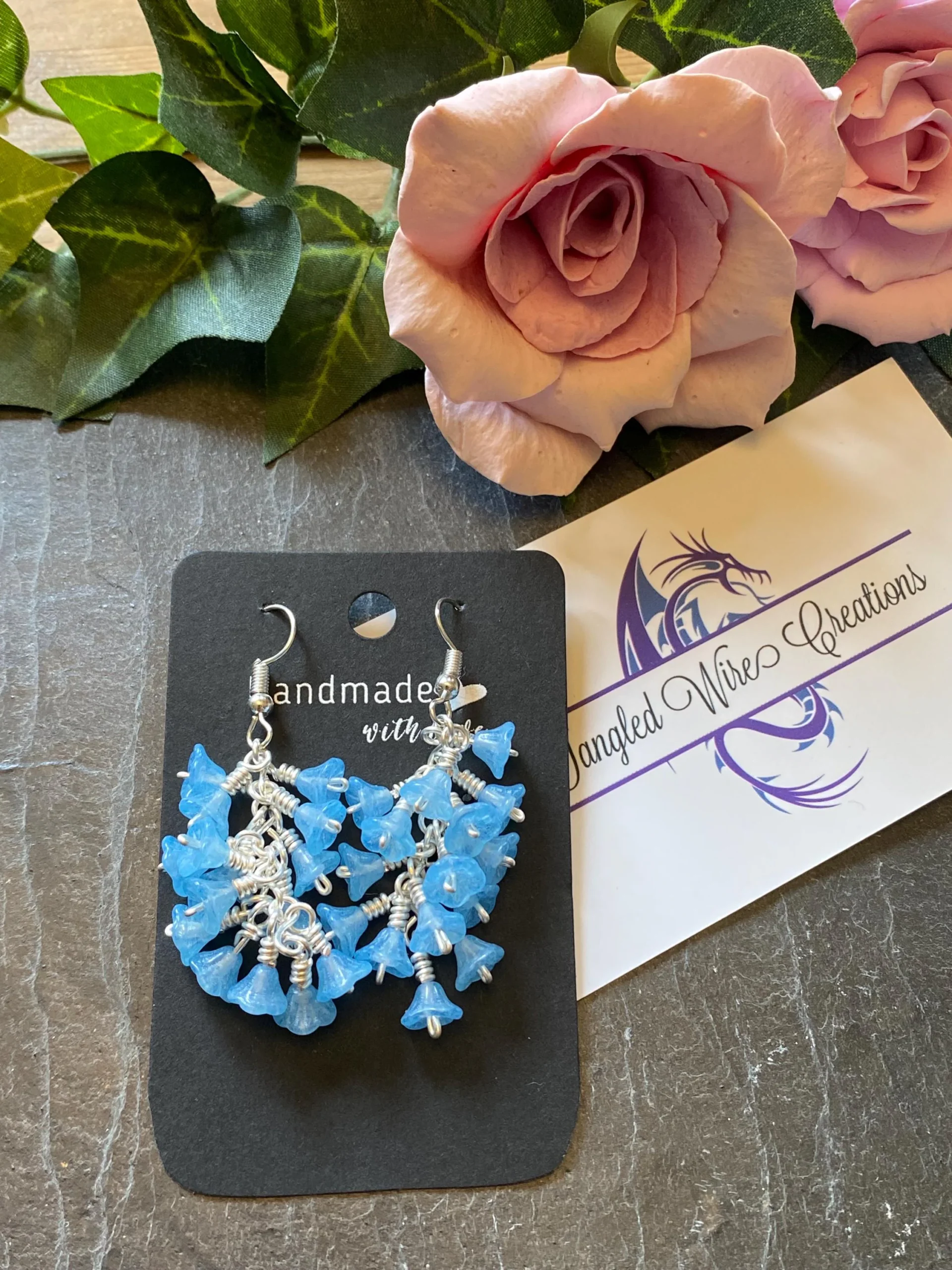 Delicate yet bold, the Bluebell Cascade Earrings bring the elegance of nature into wearable art. These handmade dangle earrings feature a graceful cascade of light blue Czech glass bell flowers, each one wire-wrapped with 10% silver-filled wire. The design creates movement and sparkle, making these floral earrings a charming statement piece.