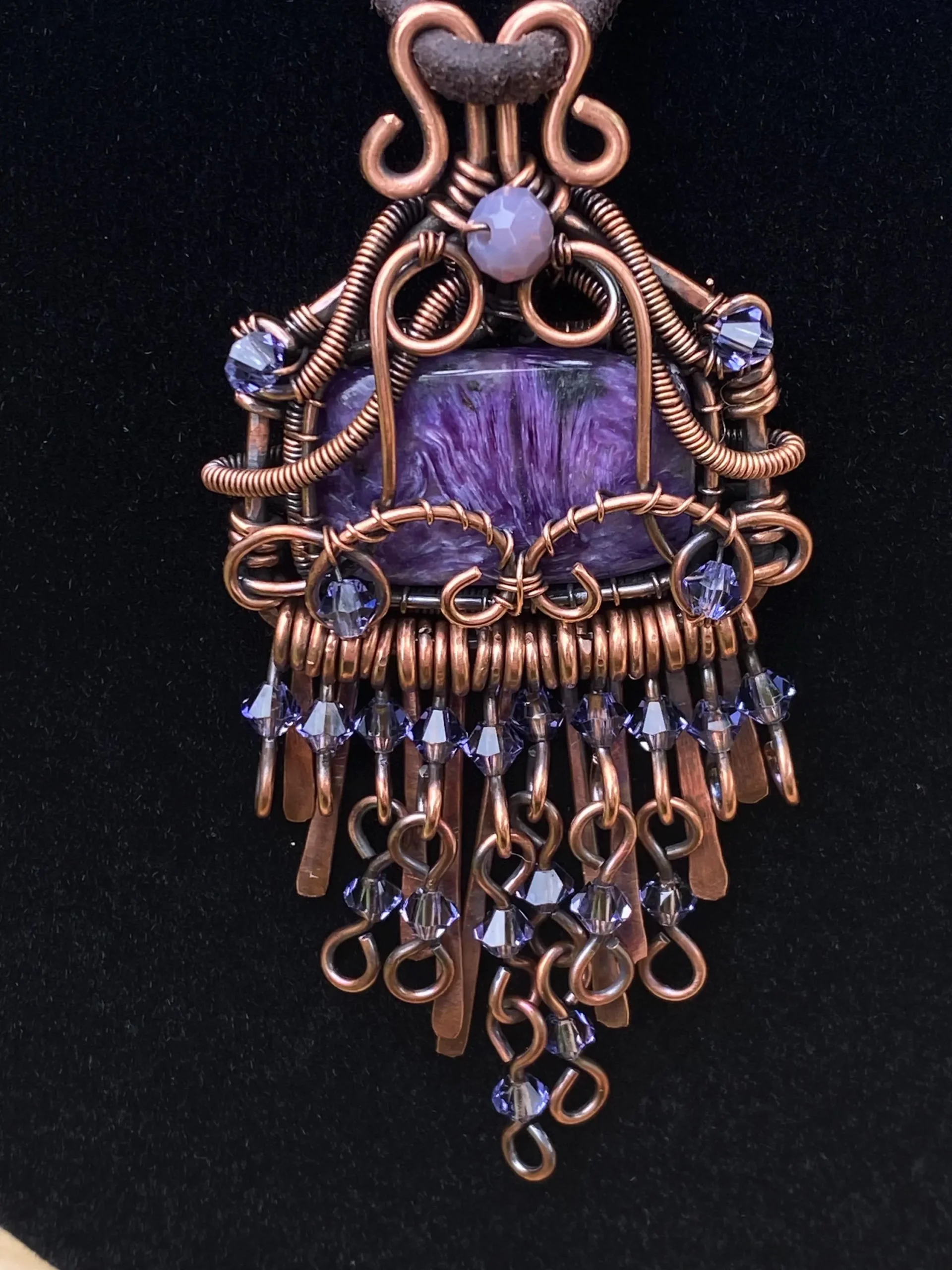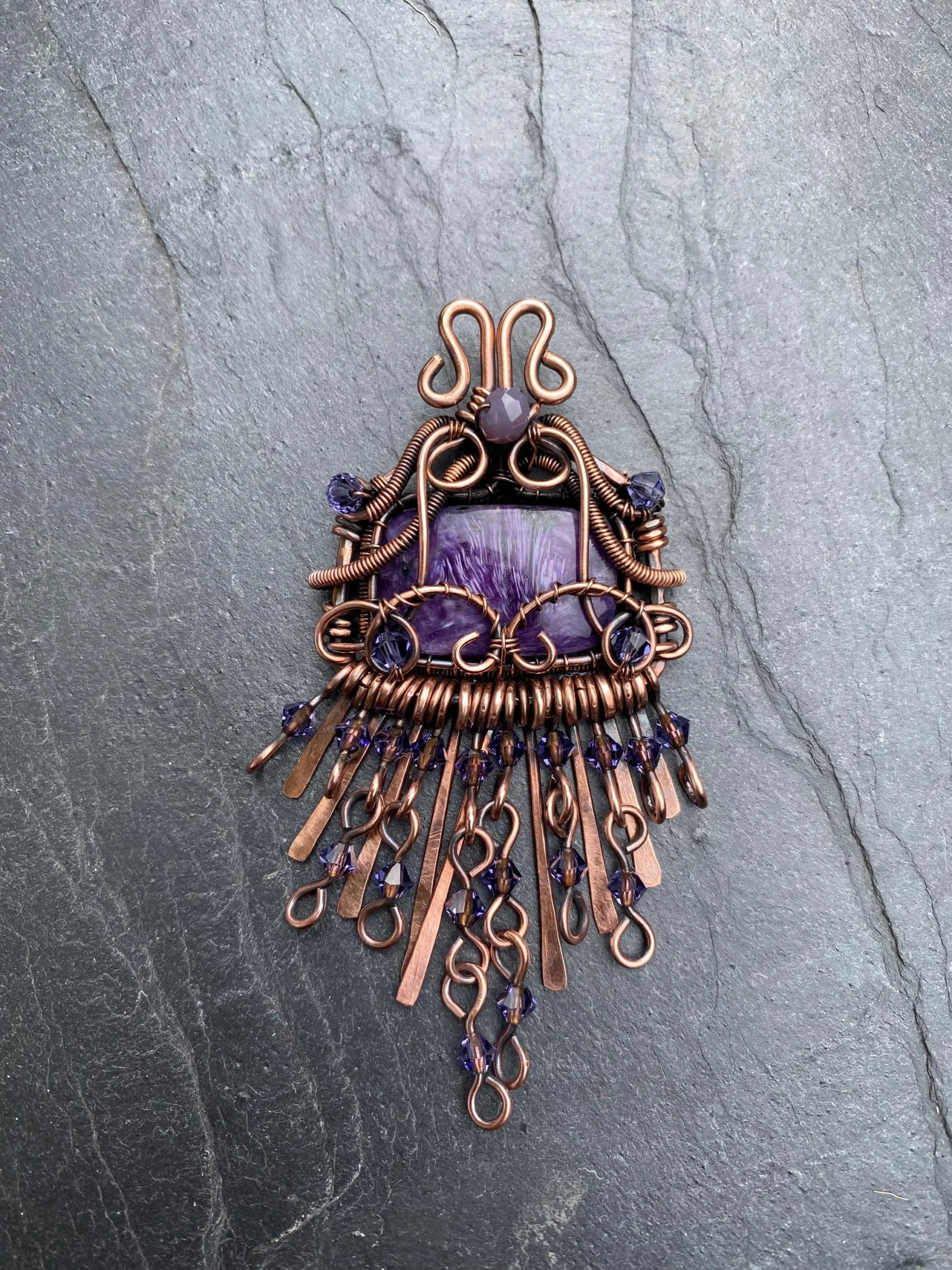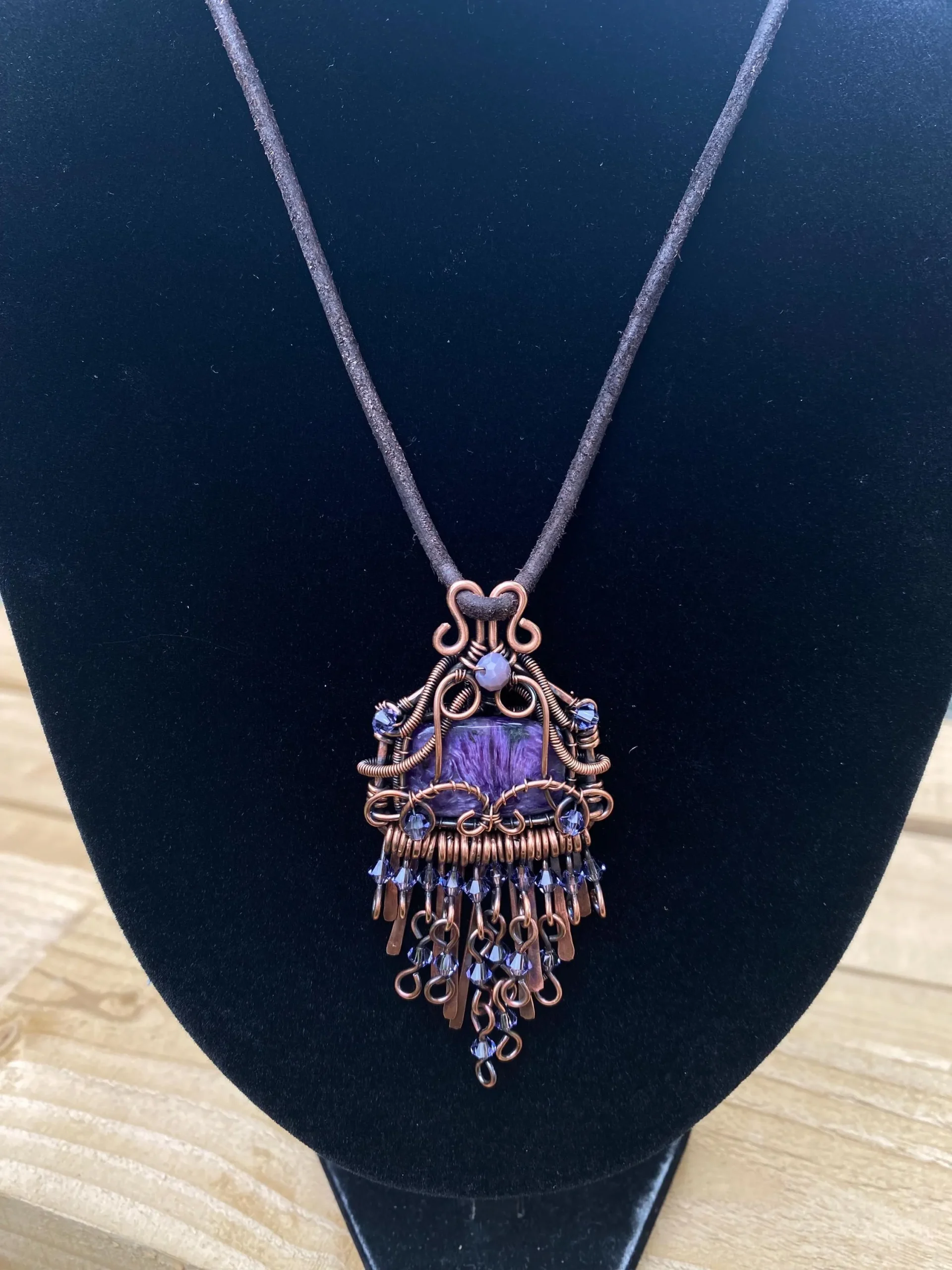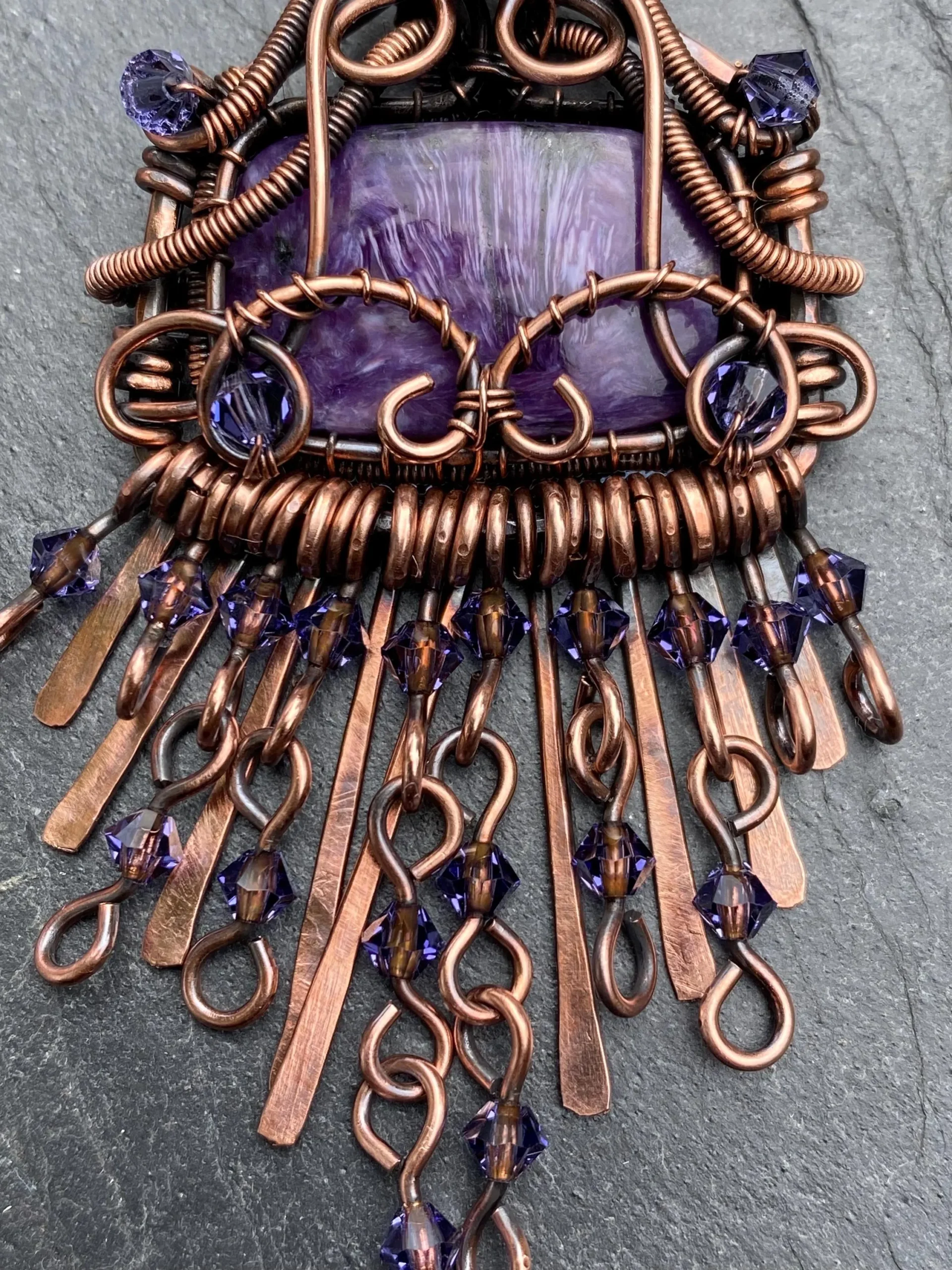 Handmade Copper Charoite Pendant with boho chic design. A unique wire wrapped crystal necklace for style, energy, and transformation.