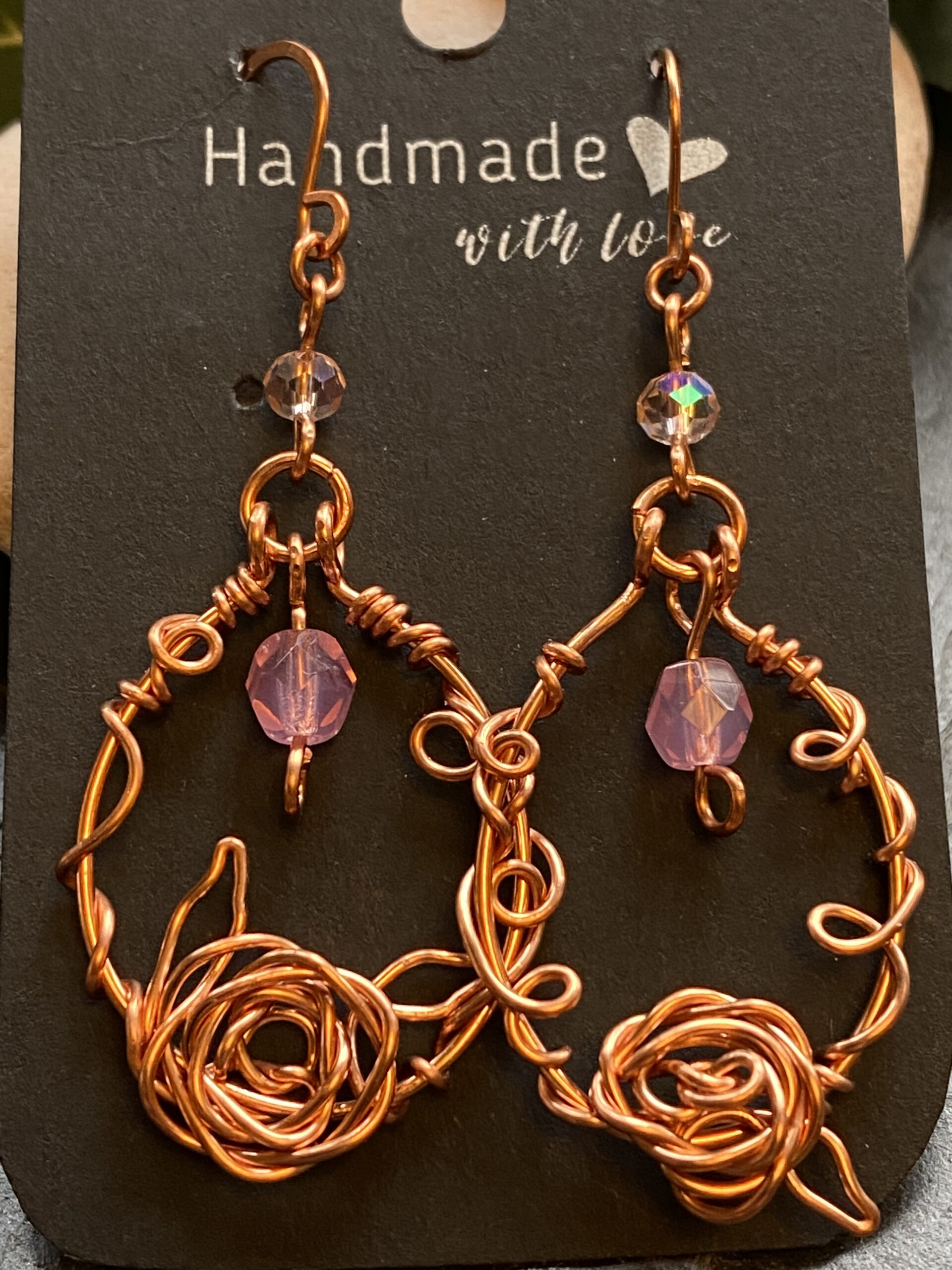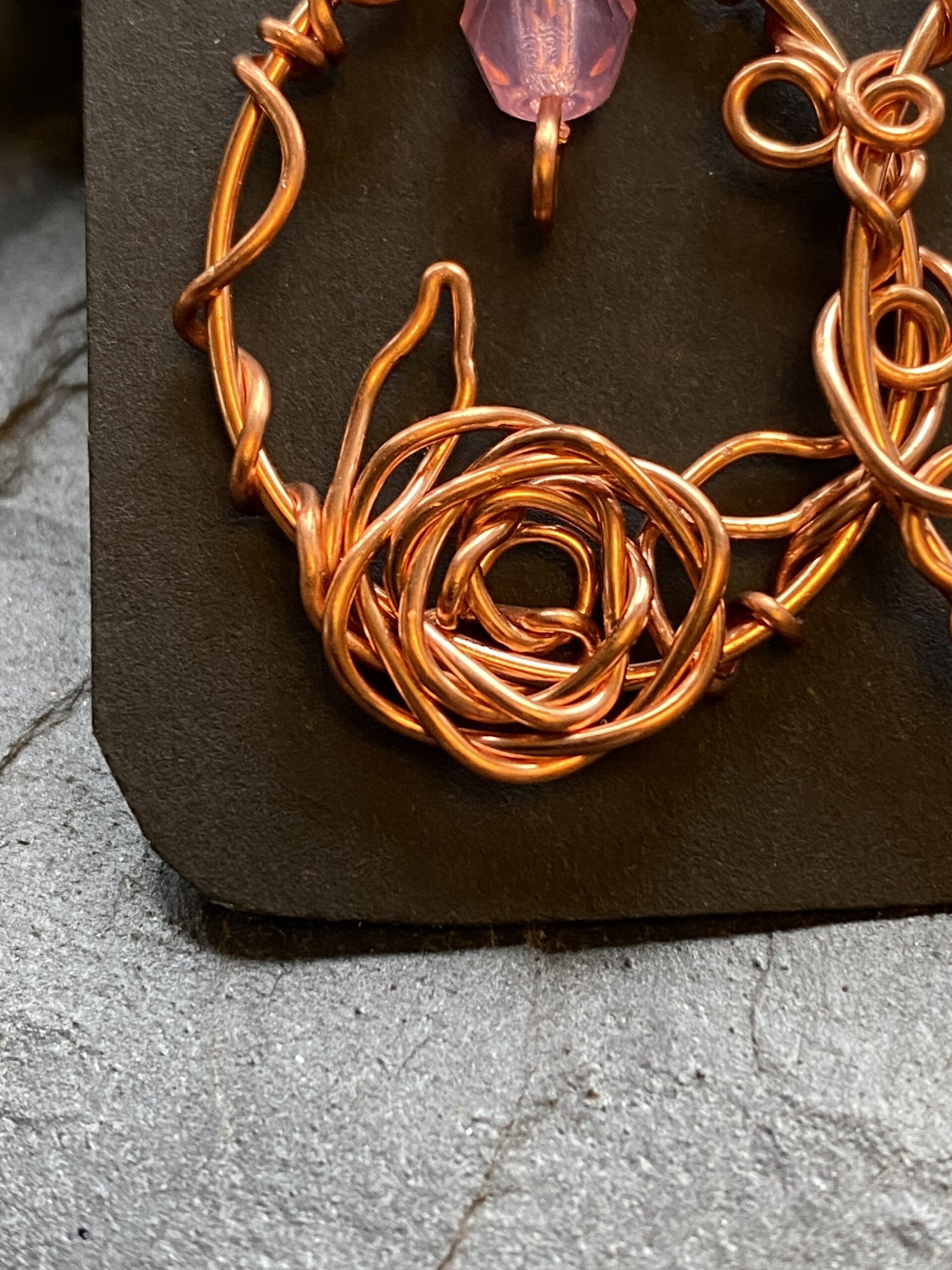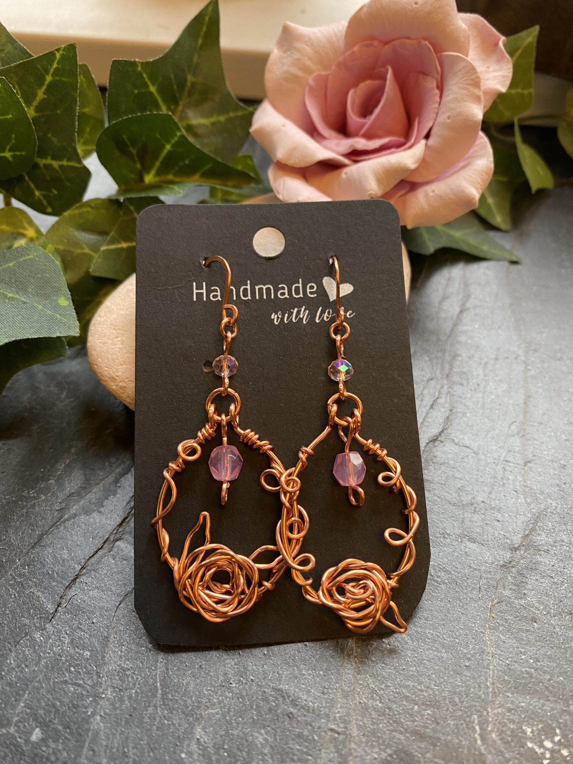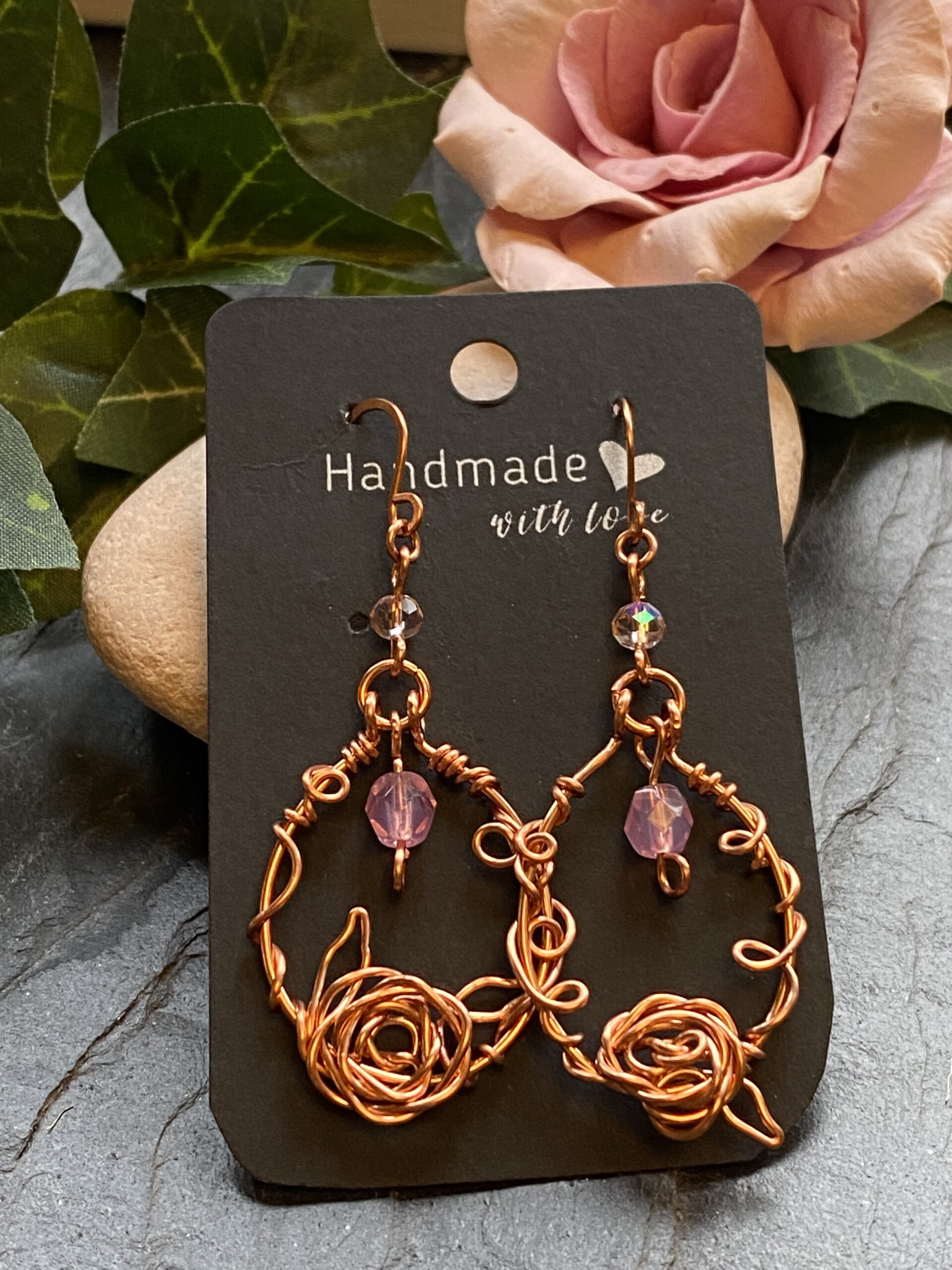 At the base of each loop sits a hand-formed wire rose embellishment. I create the rose by carefully coiling and shaping copper wire, allowing the metal to flow naturally into a floral form. This detail adds a sculptural focal point and makes each pair slightly different, celebrating the handmade process.