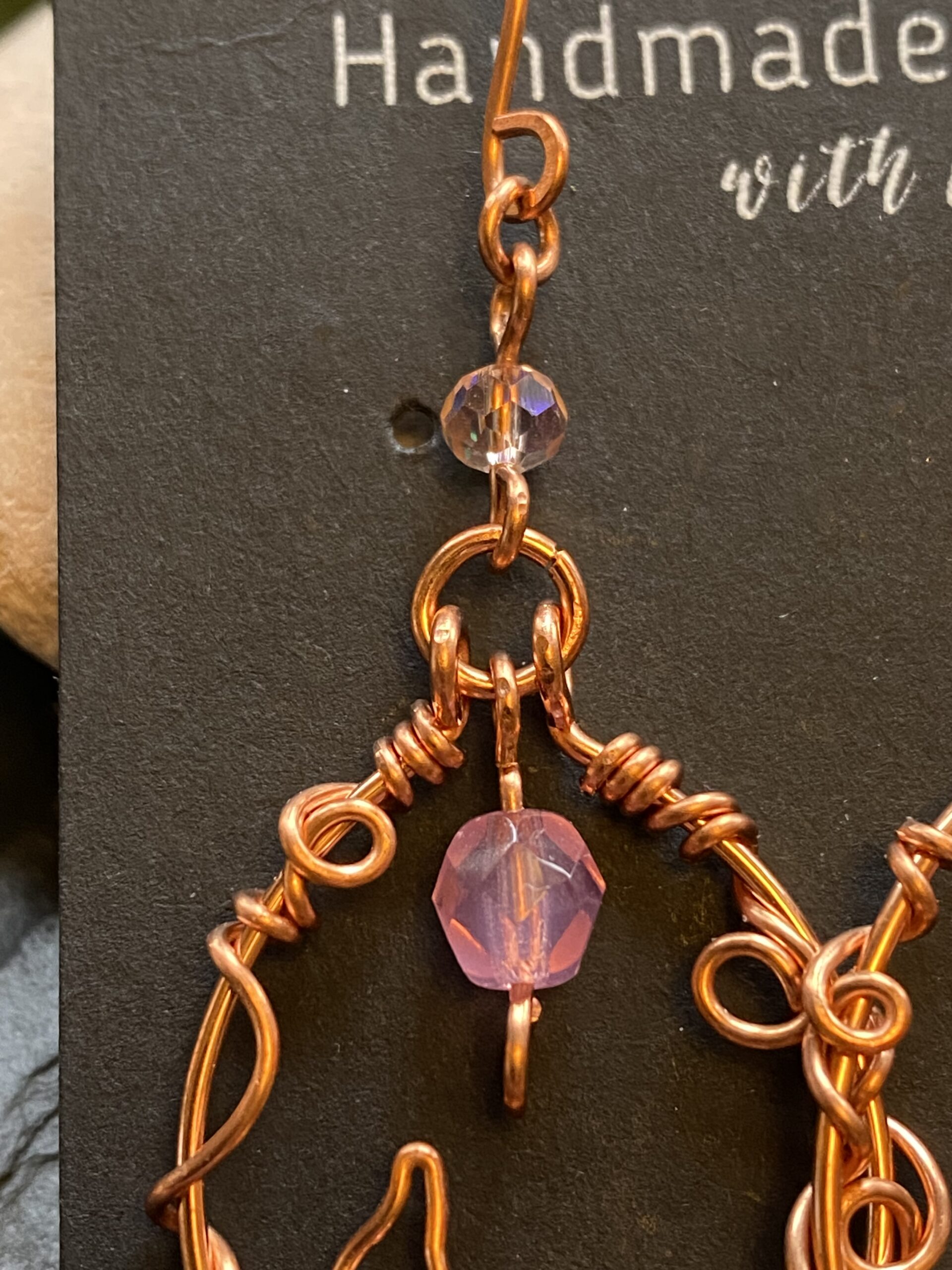 Soft pink glass beads accent the design and bring gentle colour to the warm copper tones. I wrap each bead by hand and position it within the loop to keep the earrings balanced and visually light. The beads move freely and catch the light as you wear them, adding subtle sparkle without overpowering the copper work.