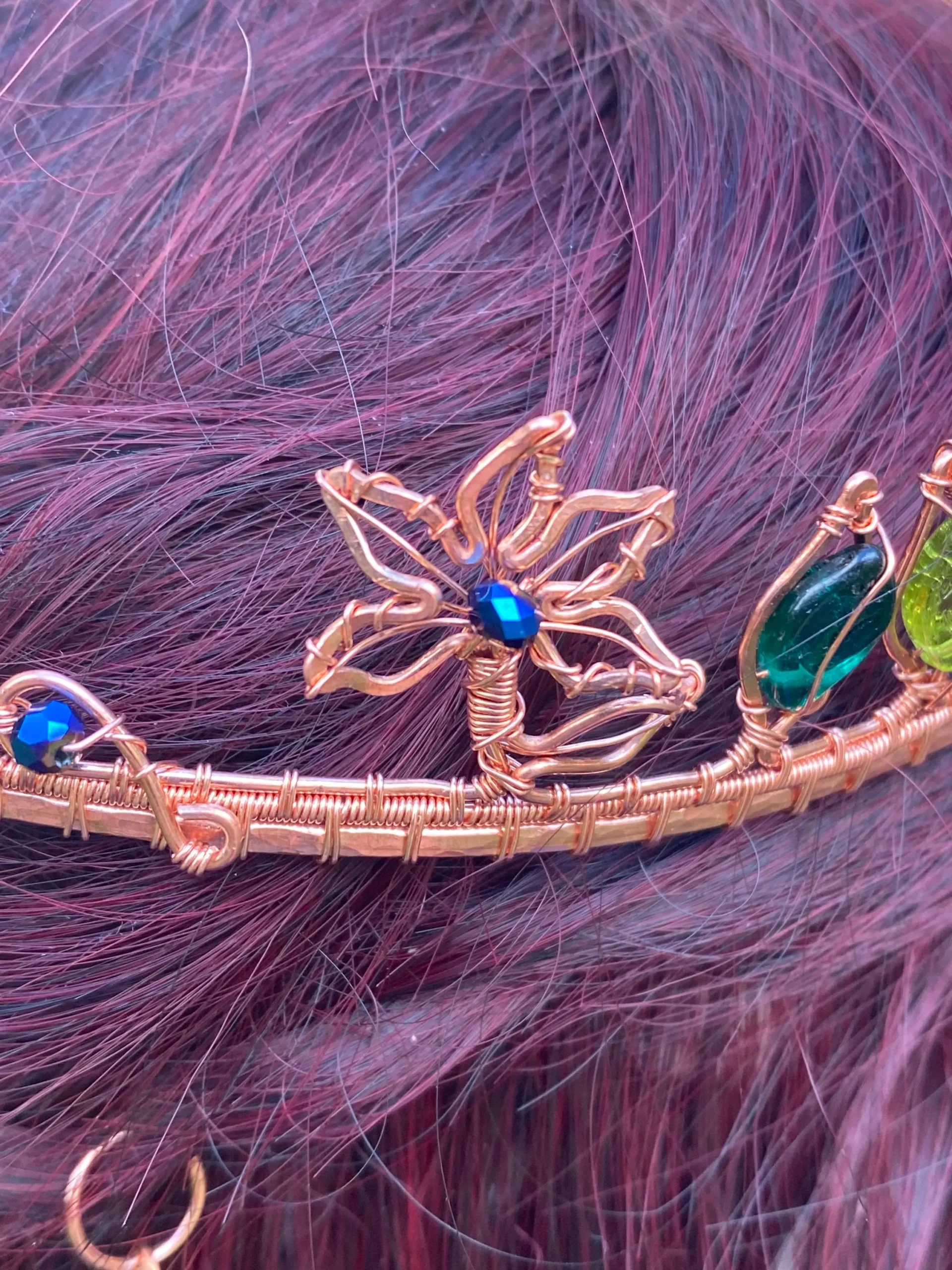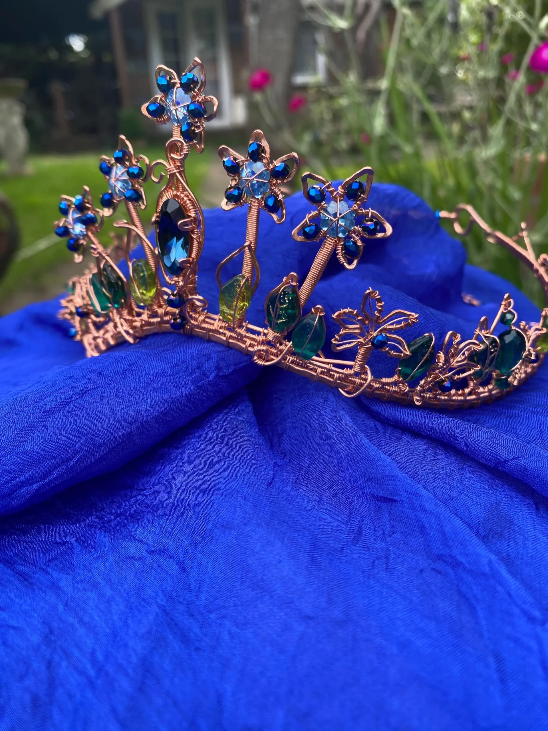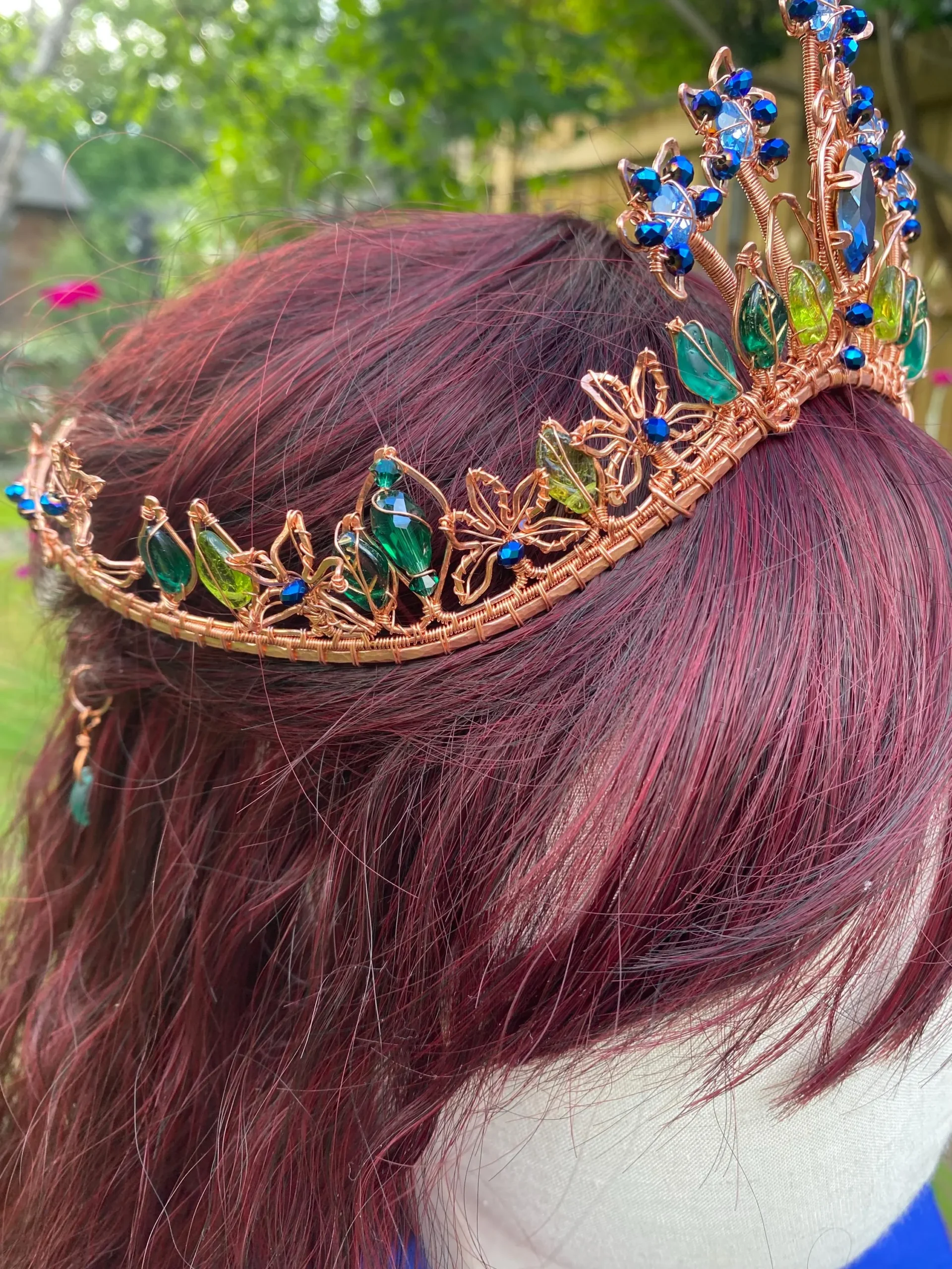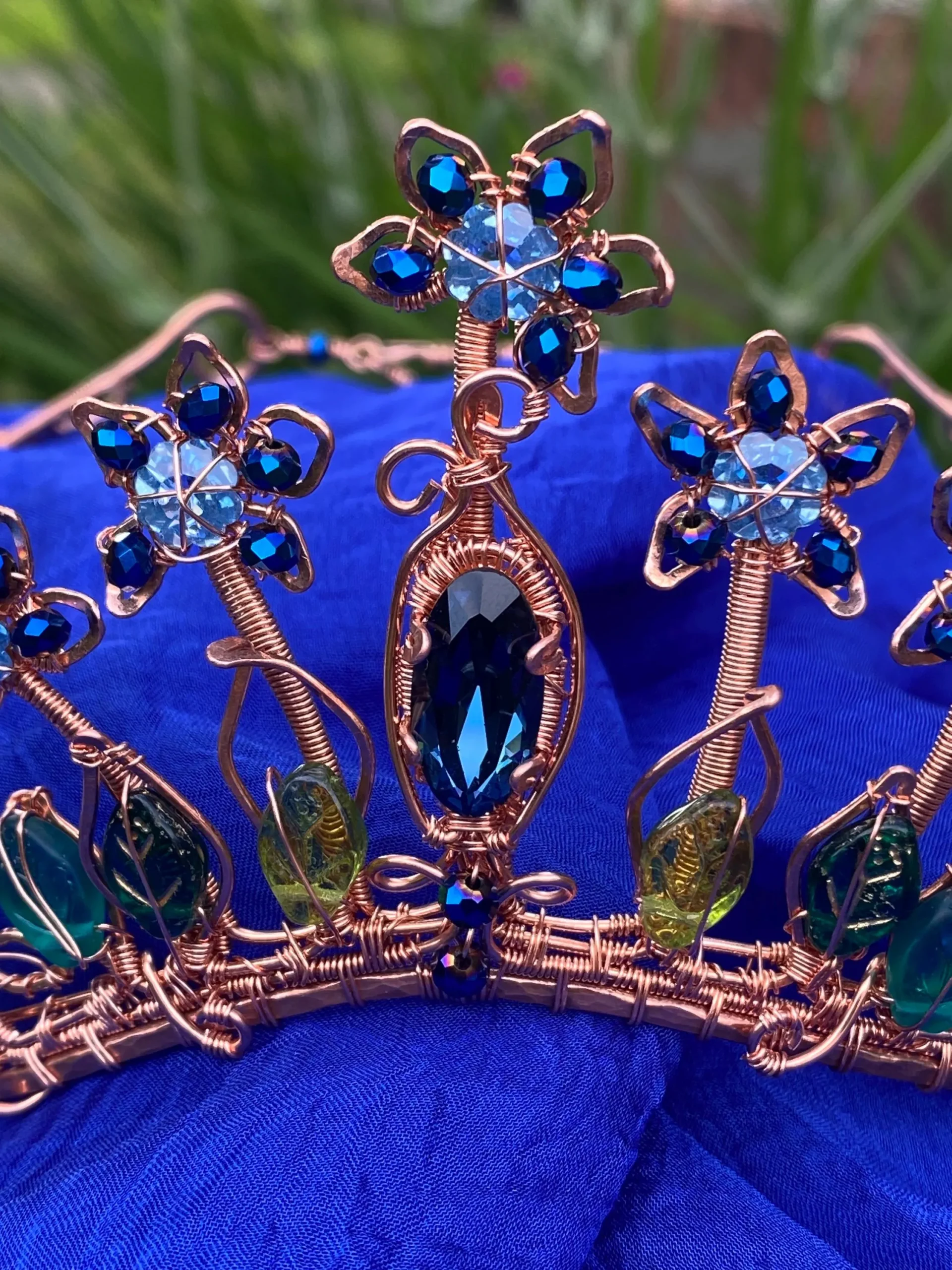 Step into a world of magic with this handcrafted Copper Tiara with Blue Crystals, inspired by enchanted forests and blooming gardens. This one-of-a-kind elven crown features intricate copper wirework, sparkling blue crystals, and delicate glass leaves, forming an elegant floral design fit for a woodland queen or fairy princess.