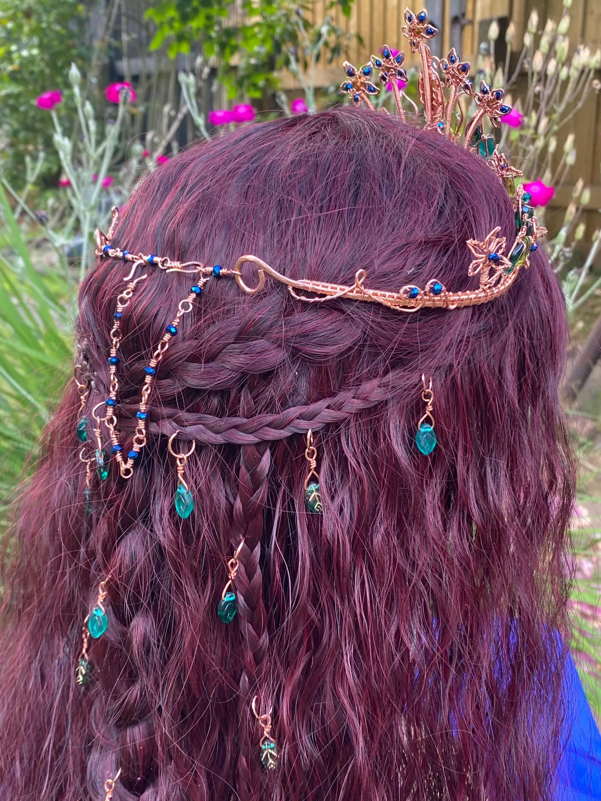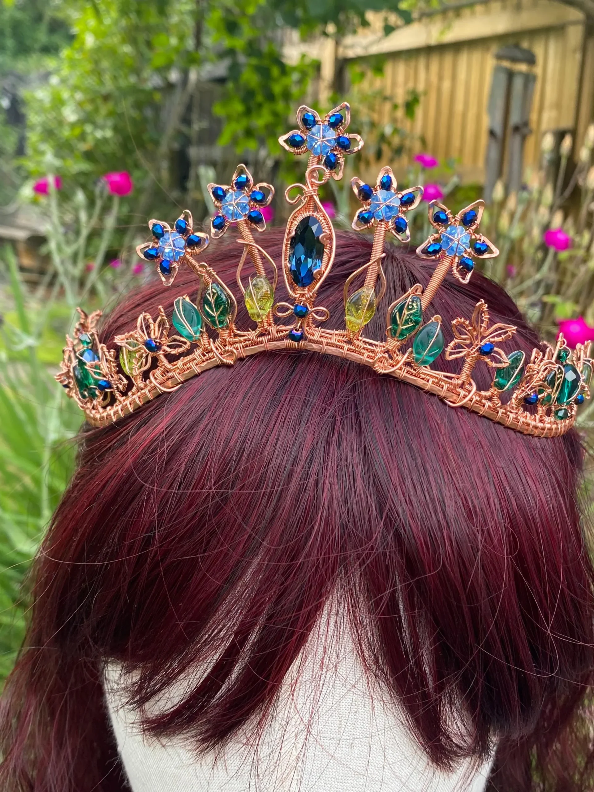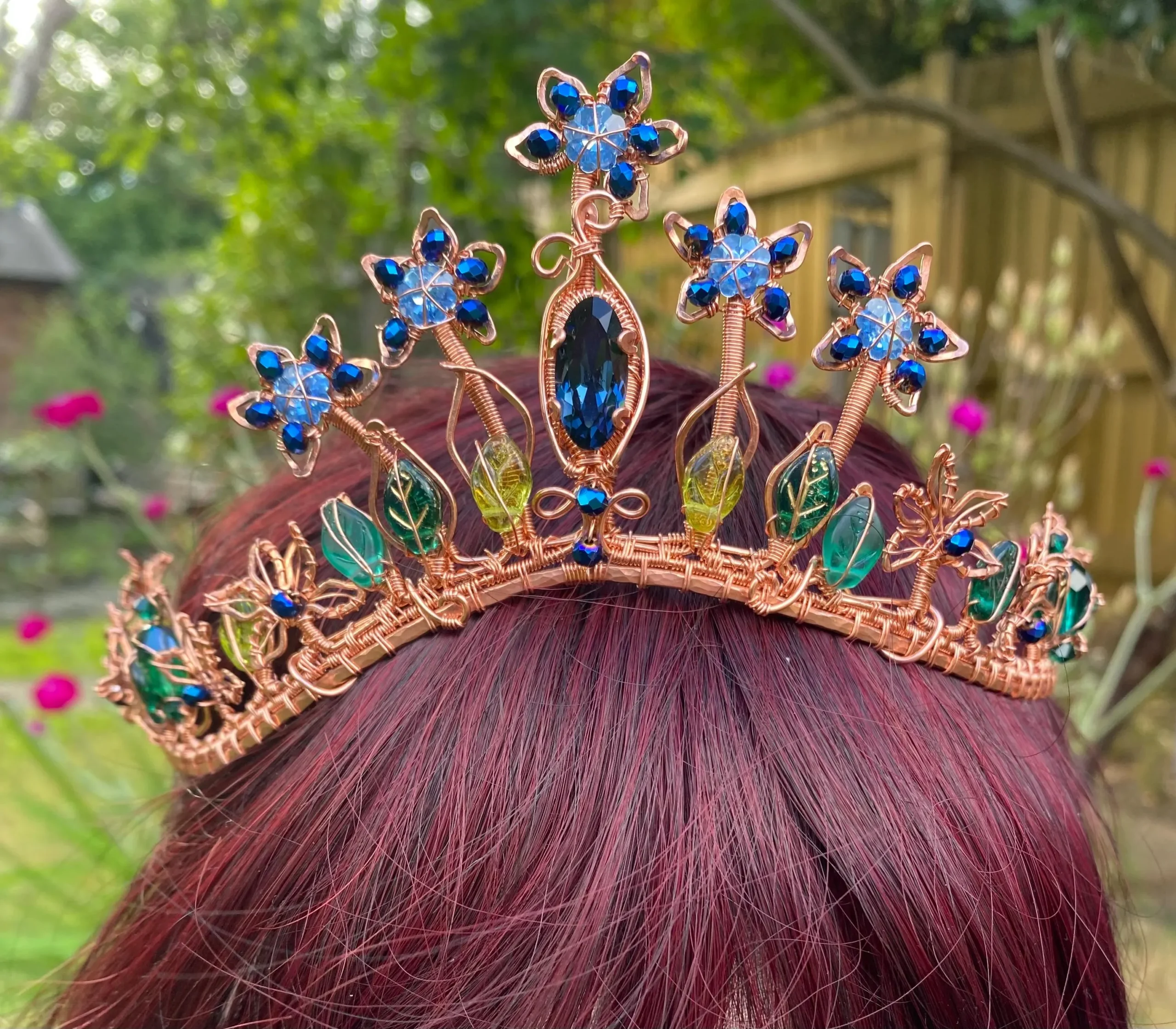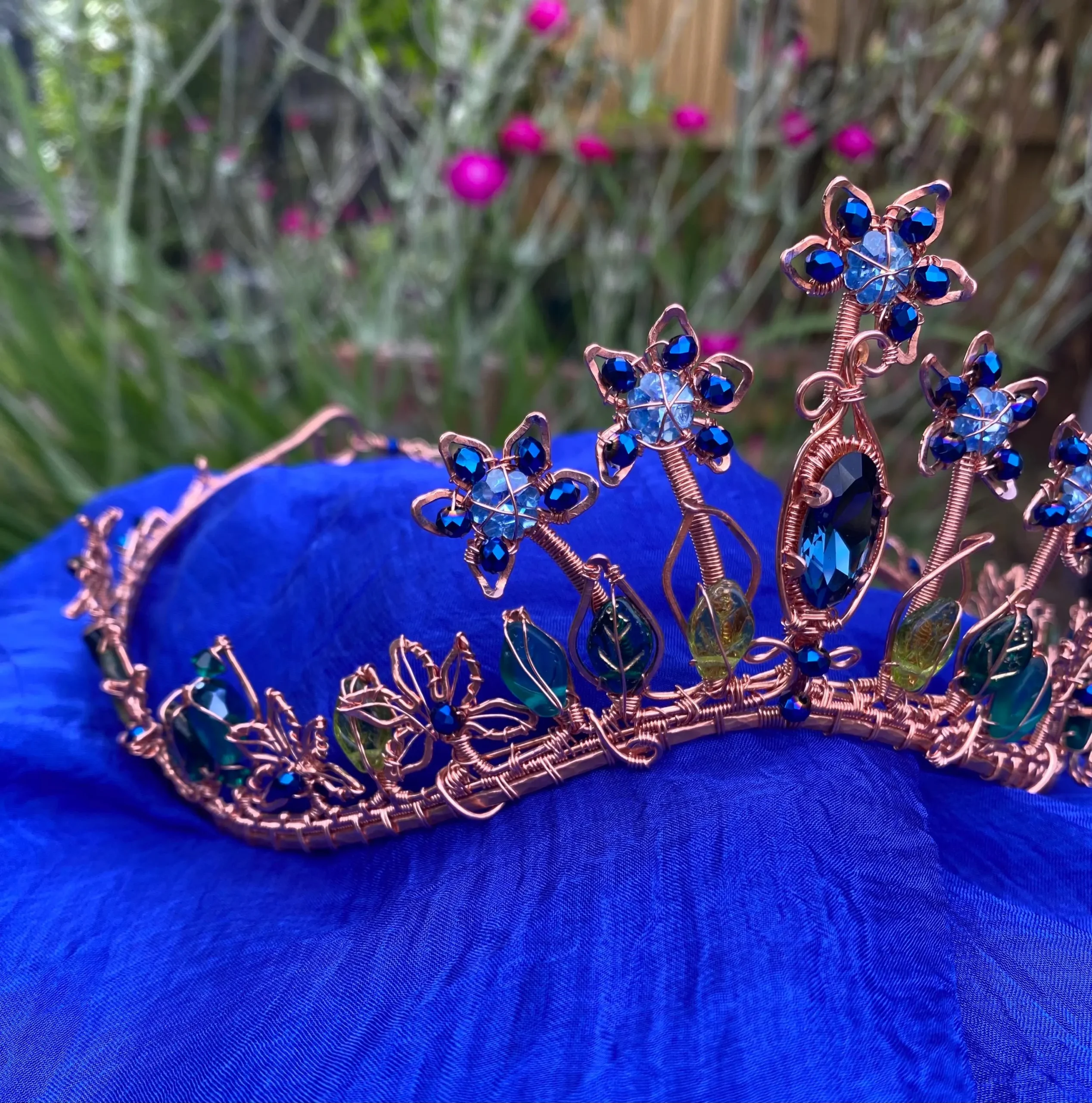 Step into a world of magic with this handcrafted Copper Tiara with Blue Crystals, inspired by enchanted forests and blooming gardens. This one-of-a-kind elven crown features intricate copper wirework, sparkling blue crystals, and delicate glass leaves, forming an elegant floral design fit for a woodland queen or fairy princess.