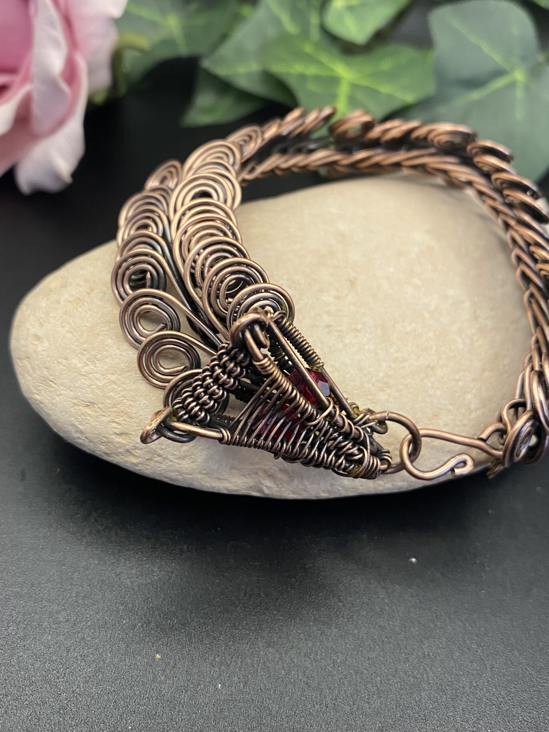 This dragon scale copper bracelet is a handcrafted piece inspired by fantasy design and detailed artisan wirework. I shape each link by hand using solid copper wire, creating a flowing pattern that reflects layered dragon scales. Then I connect every link to form a flexible and durable bracelet.