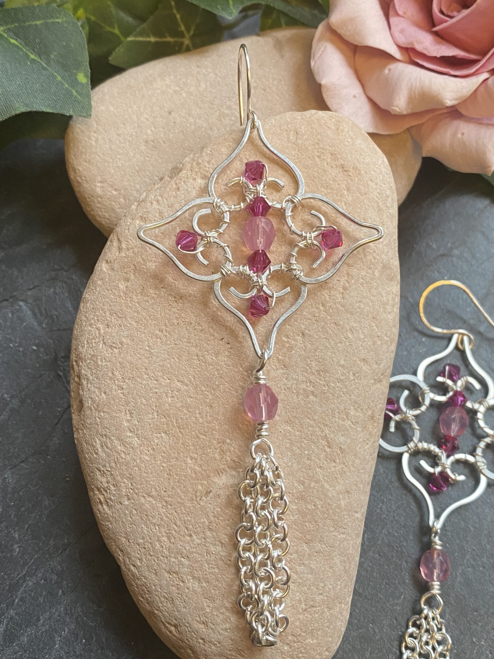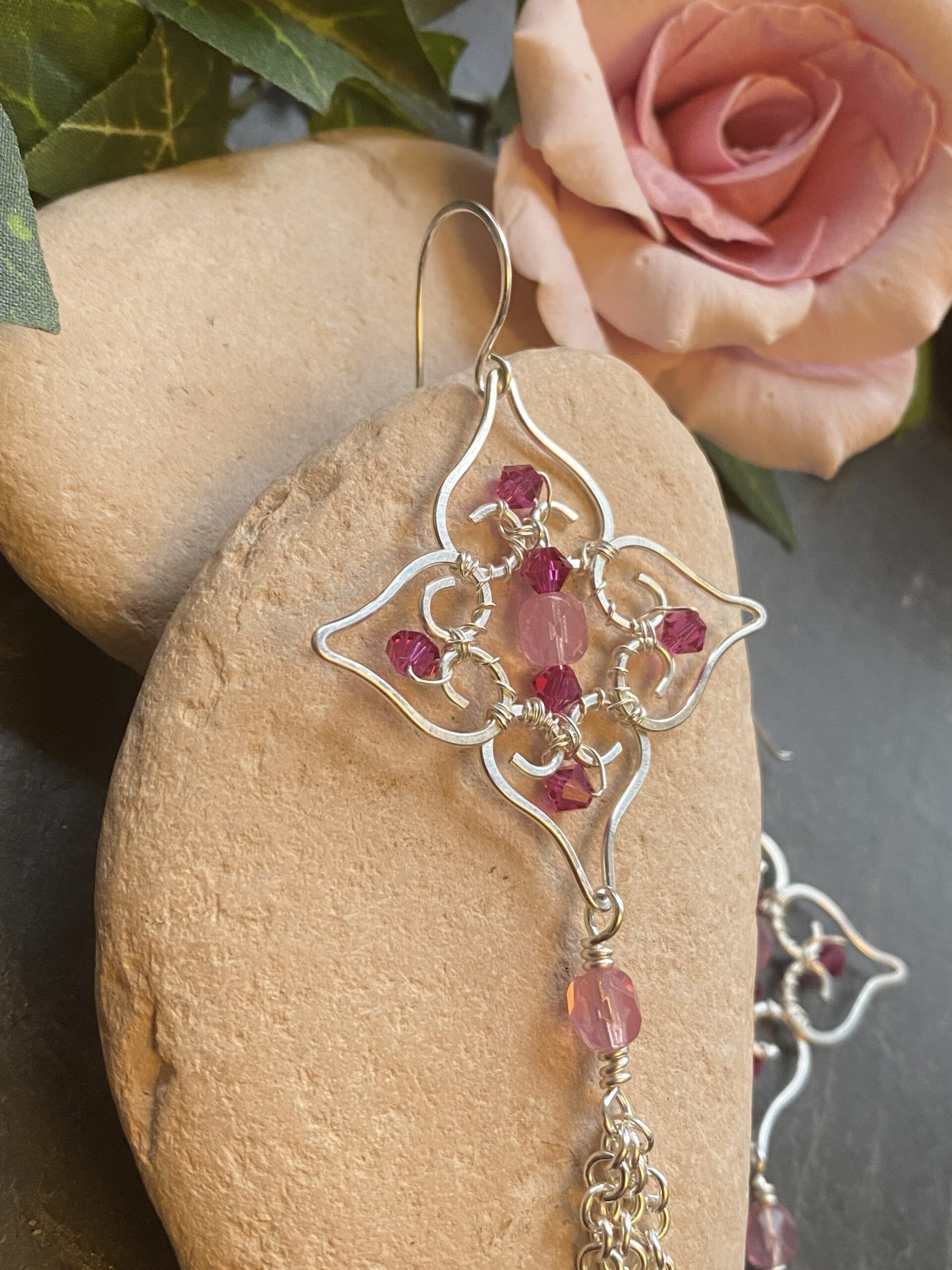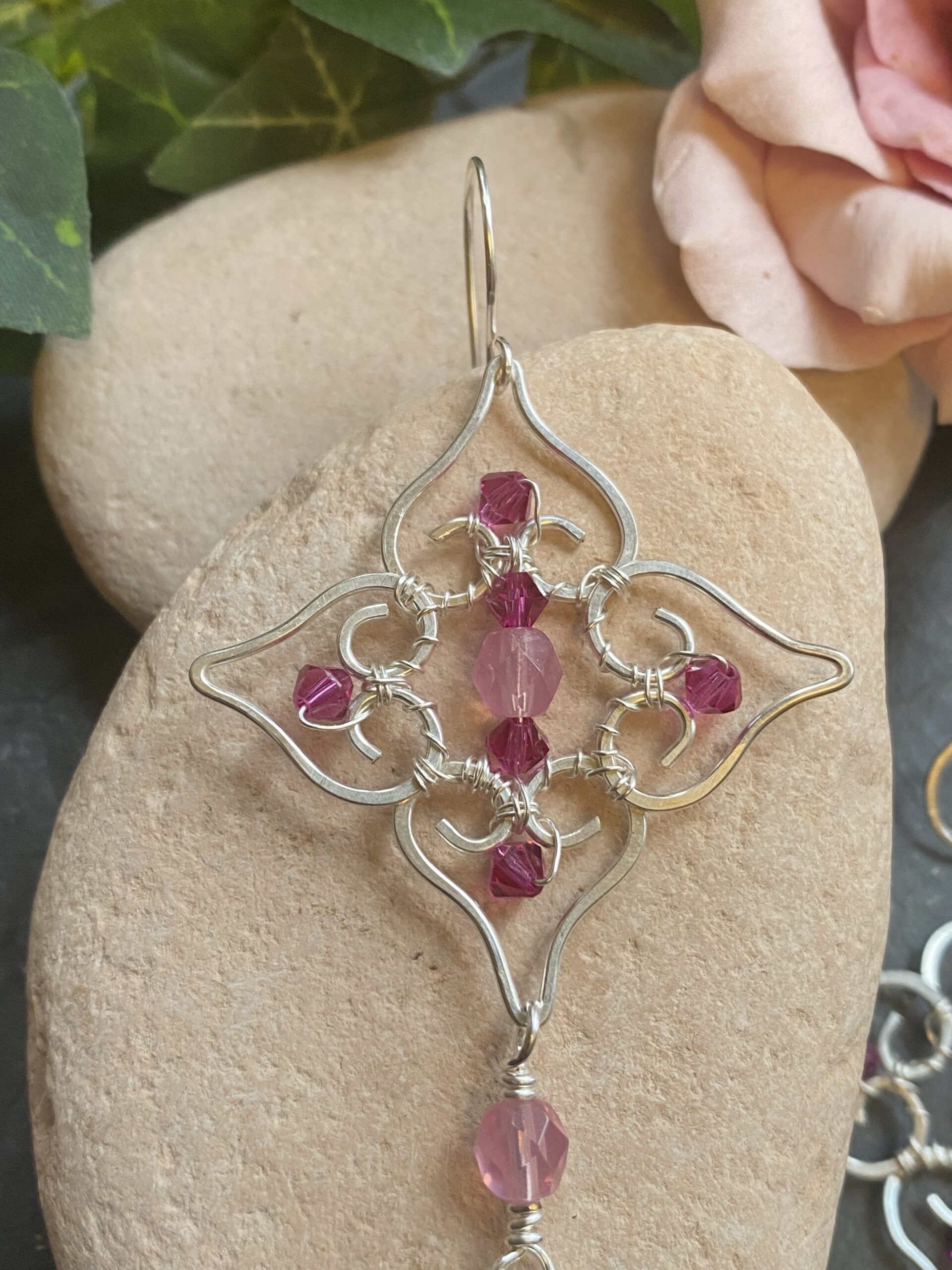 Soft pink beads sit at the centre of the filigree and add gentle colour to the silver plated finish. I wrap each bead by hand to keep the design balanced and secure. Hammered wire details add texture and give the earrings a subtle shine without overpowering the overall look.