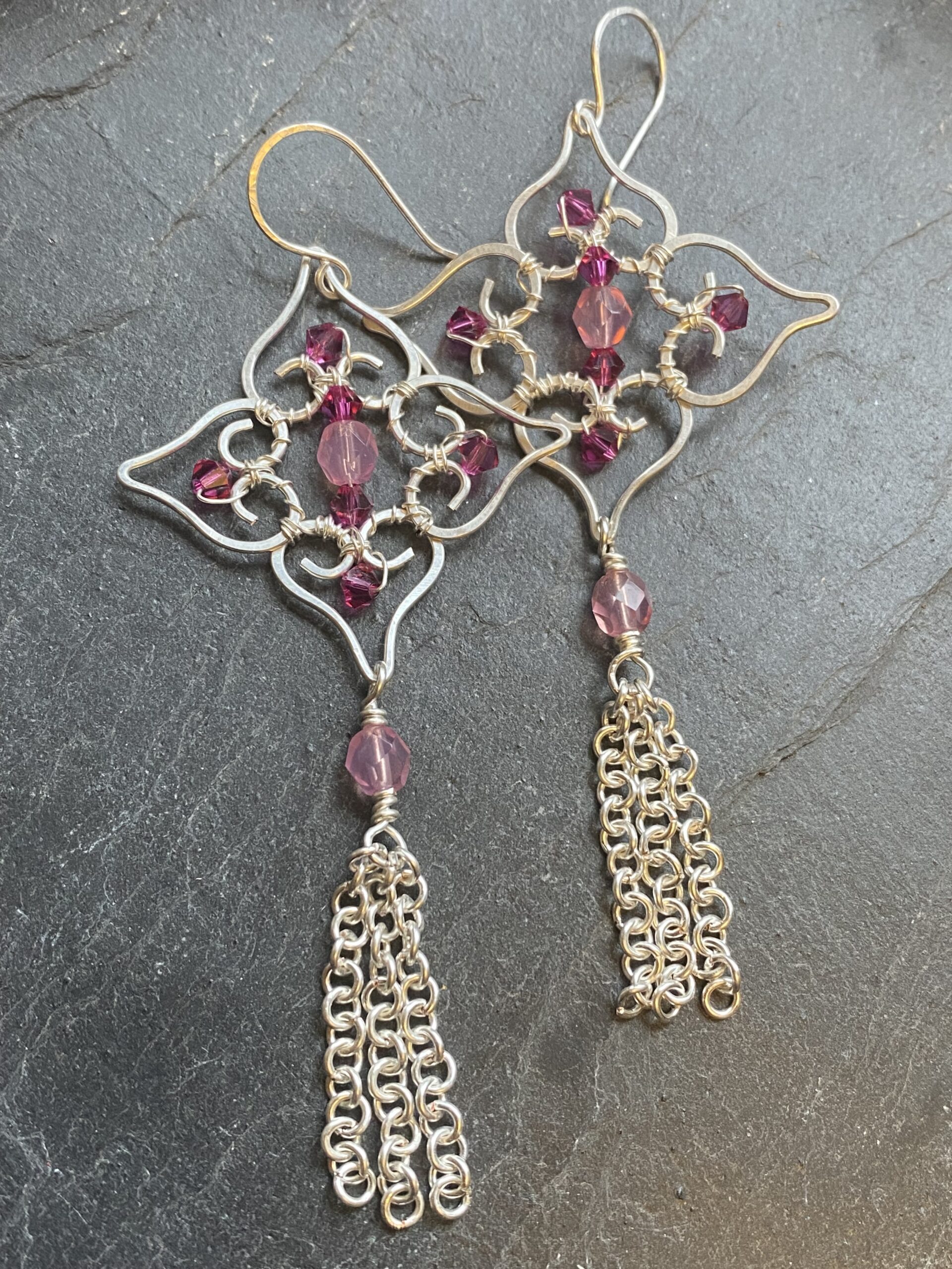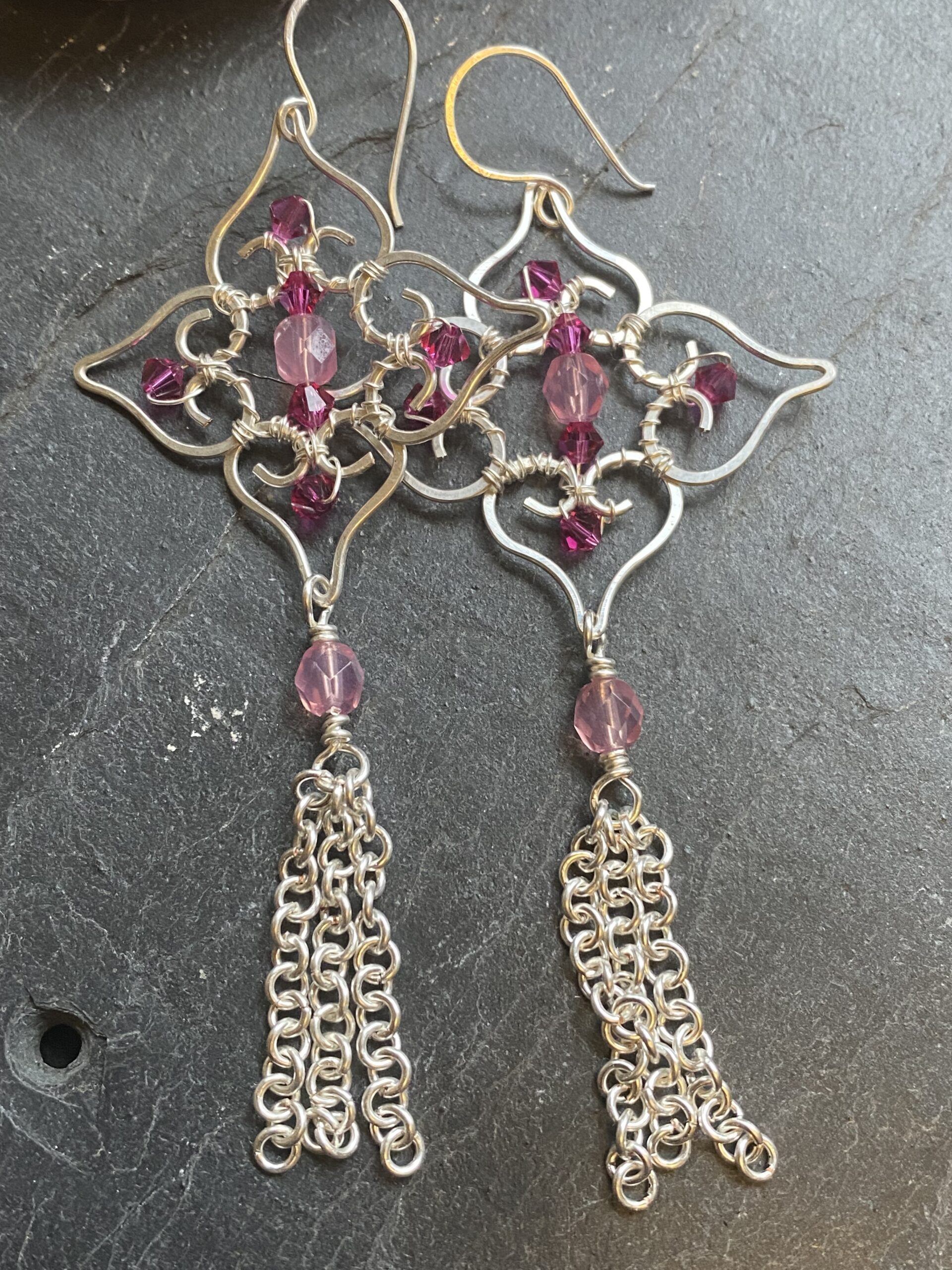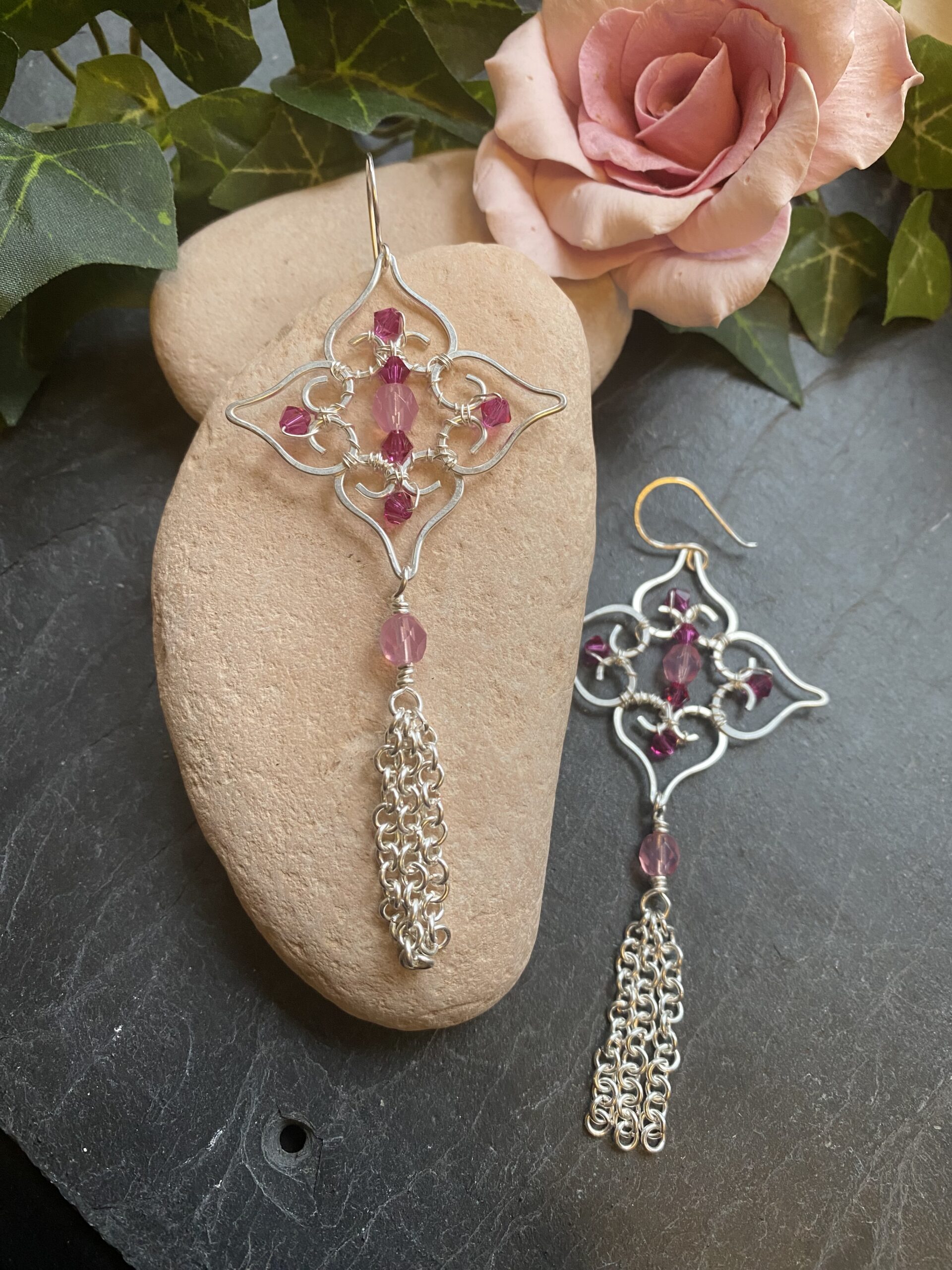 Soft pink beads sit at the centre of the filigree and add gentle colour to the silver plated finish. I wrap each bead by hand to keep the design balanced and secure. Hammered wire details add texture and give the earrings a subtle shine without overpowering the overall look.