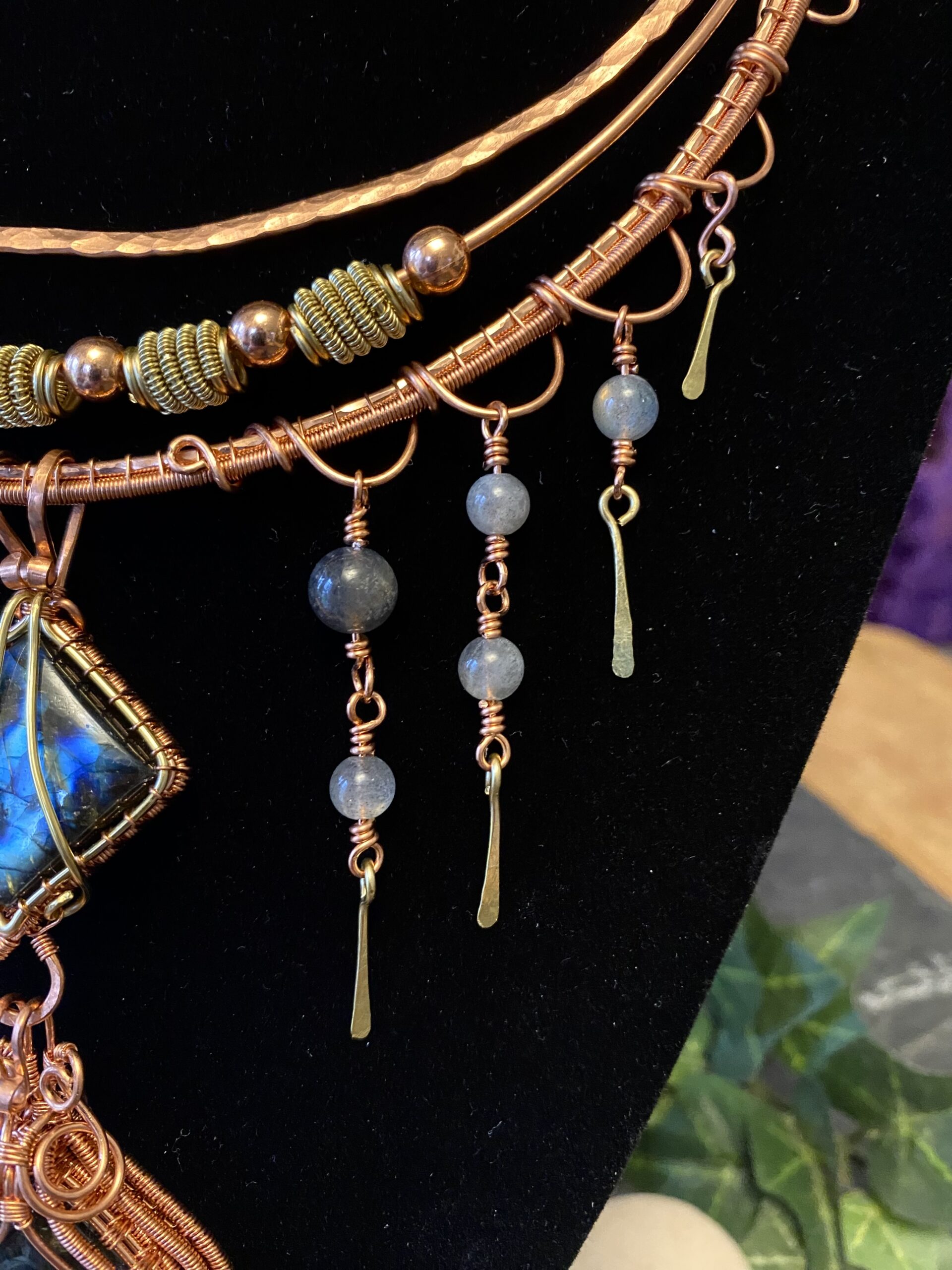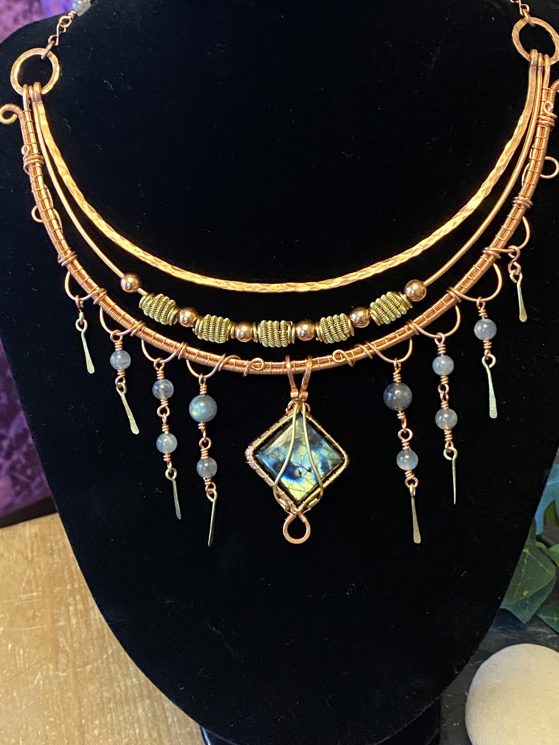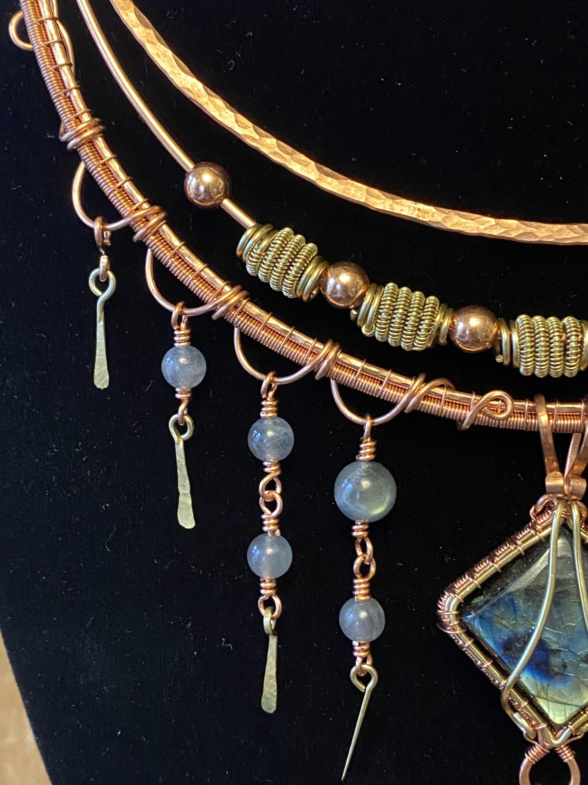 First, I build the choker using multiple layers of shaped and hammered wire. These layers sit comfortably around the neck while creating depth and structure. Throughout the design, I add labradorite beads that bring soft flashes of blue and grey as the necklace moves.