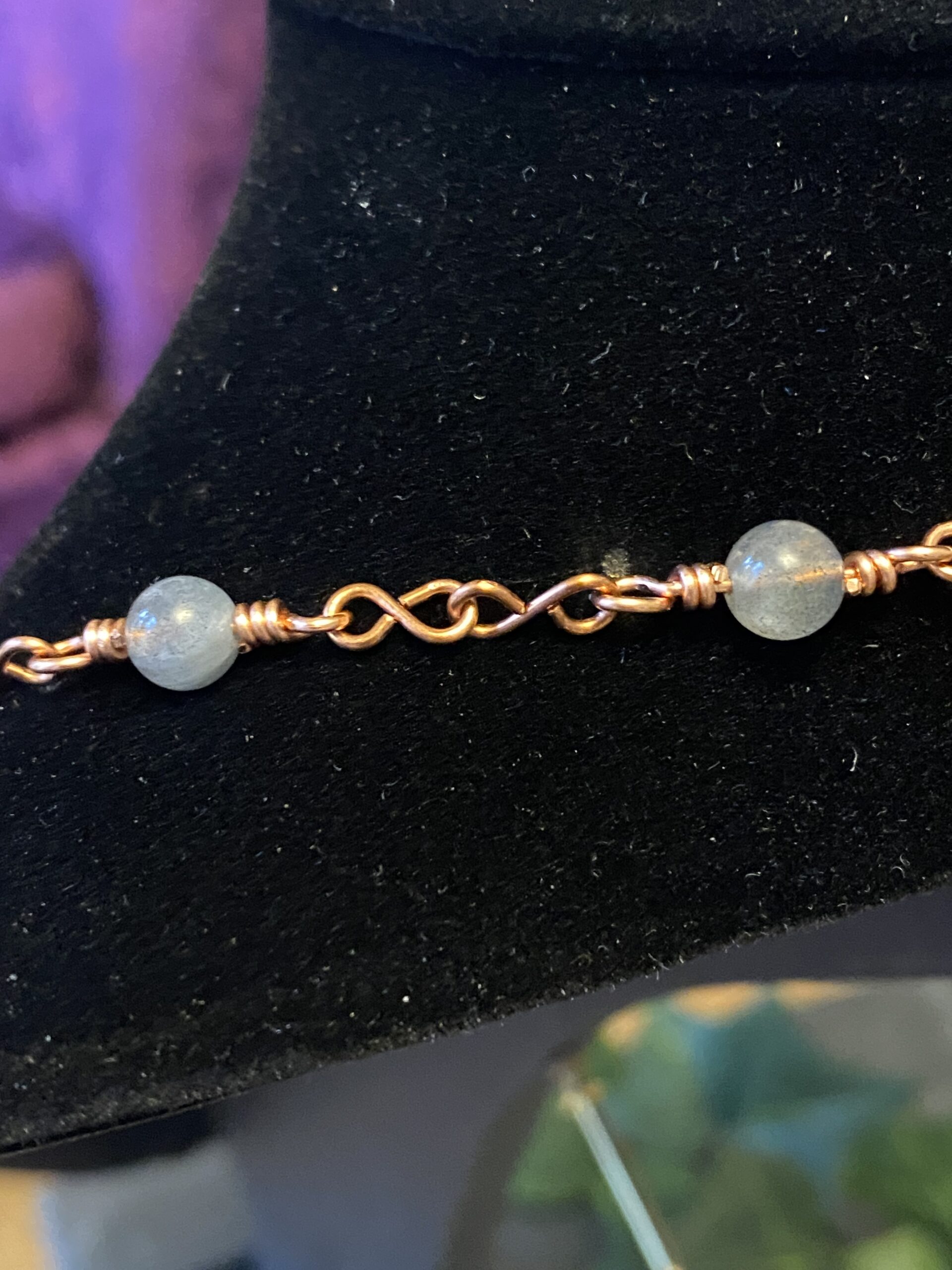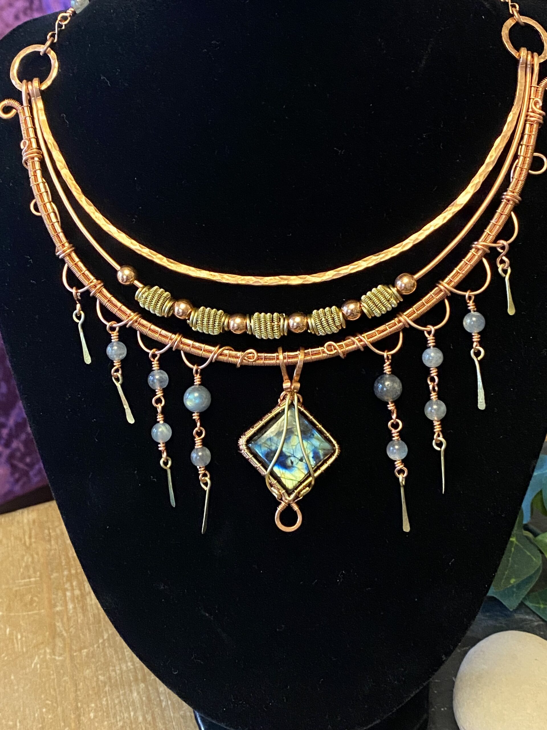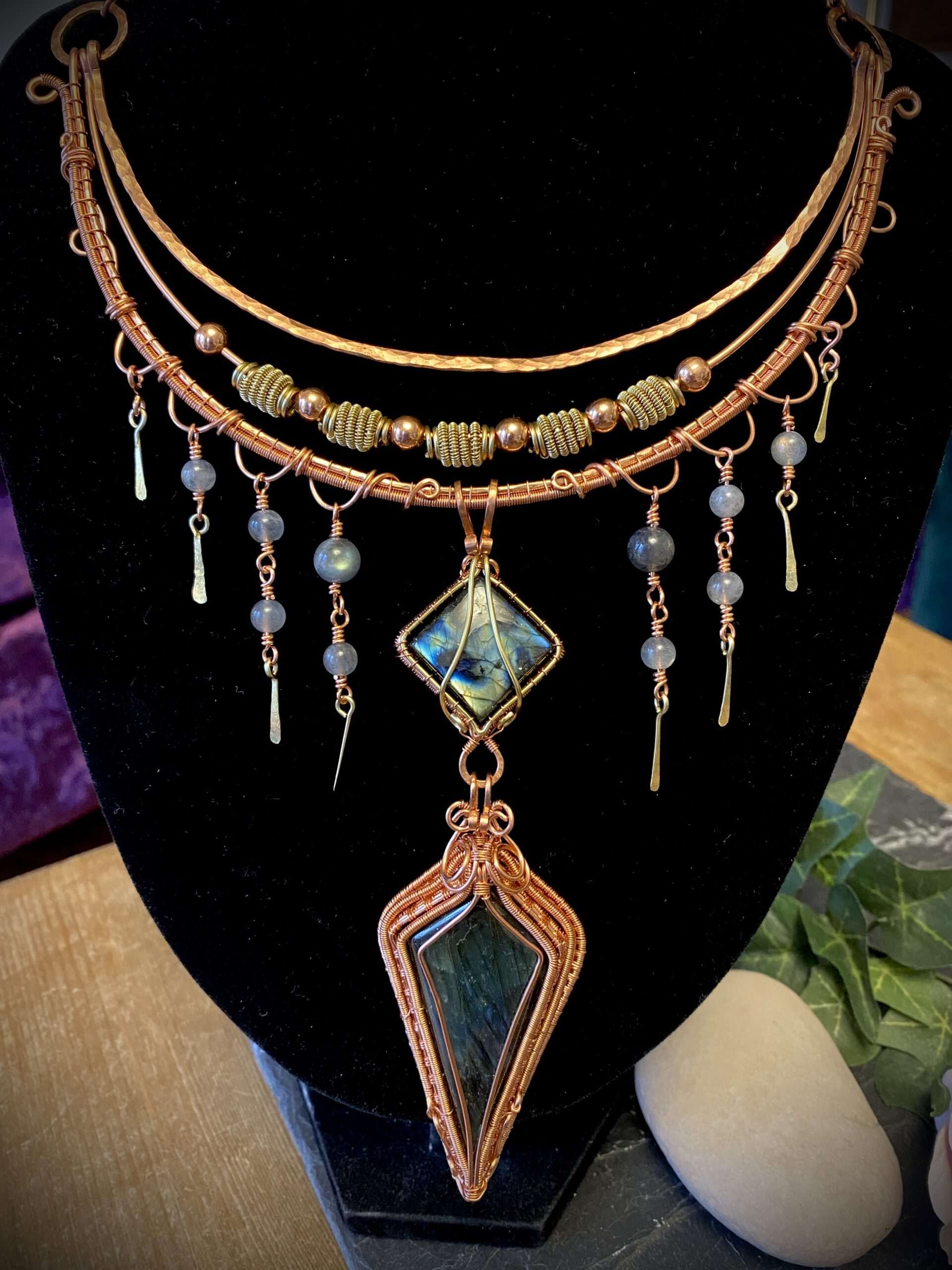First, I build the choker using multiple layers of shaped and hammered wire. These layers sit comfortably around the neck while creating depth and structure. Throughout the design, I add labradorite beads that bring soft flashes of blue and grey as the necklace moves.