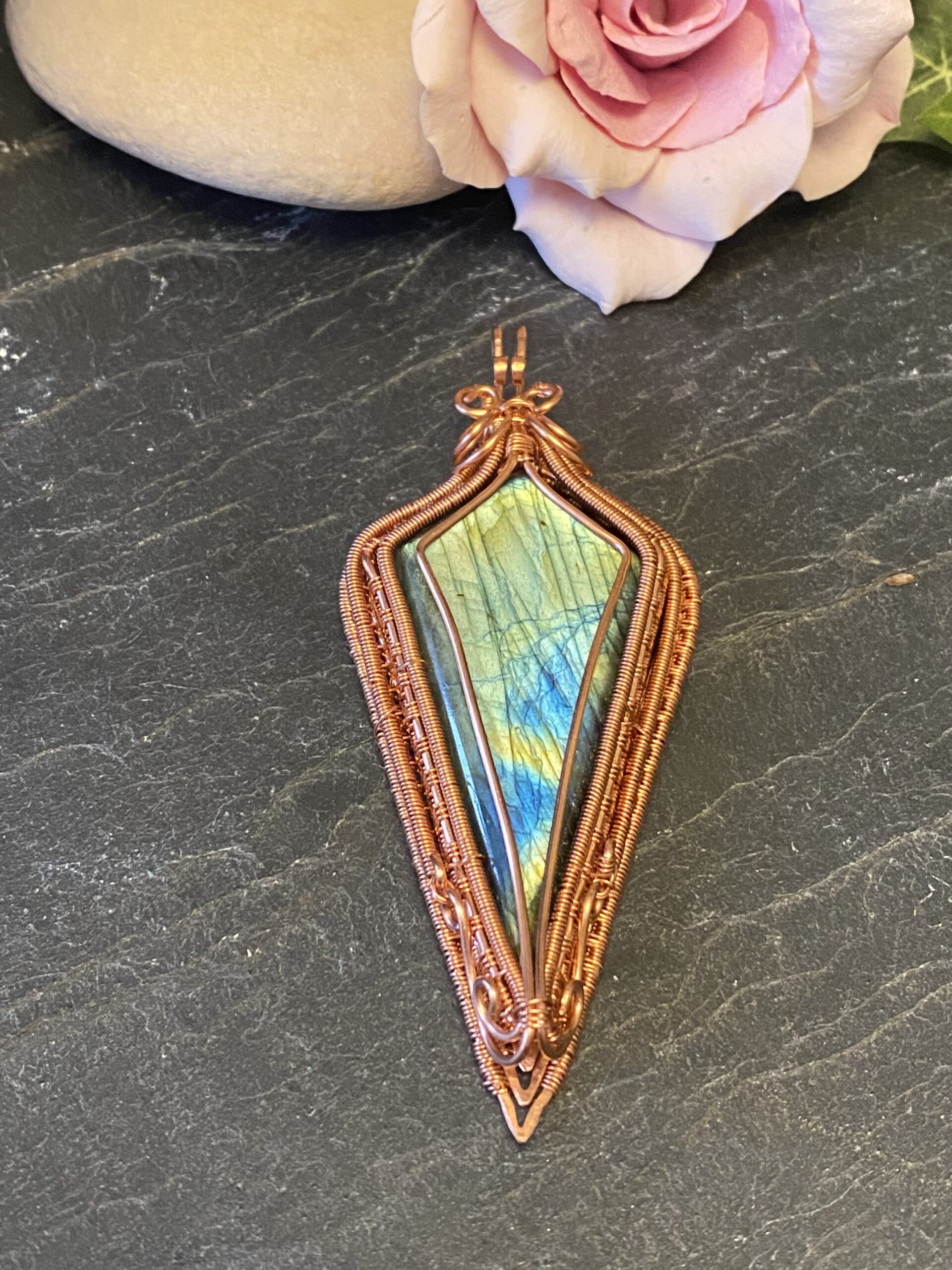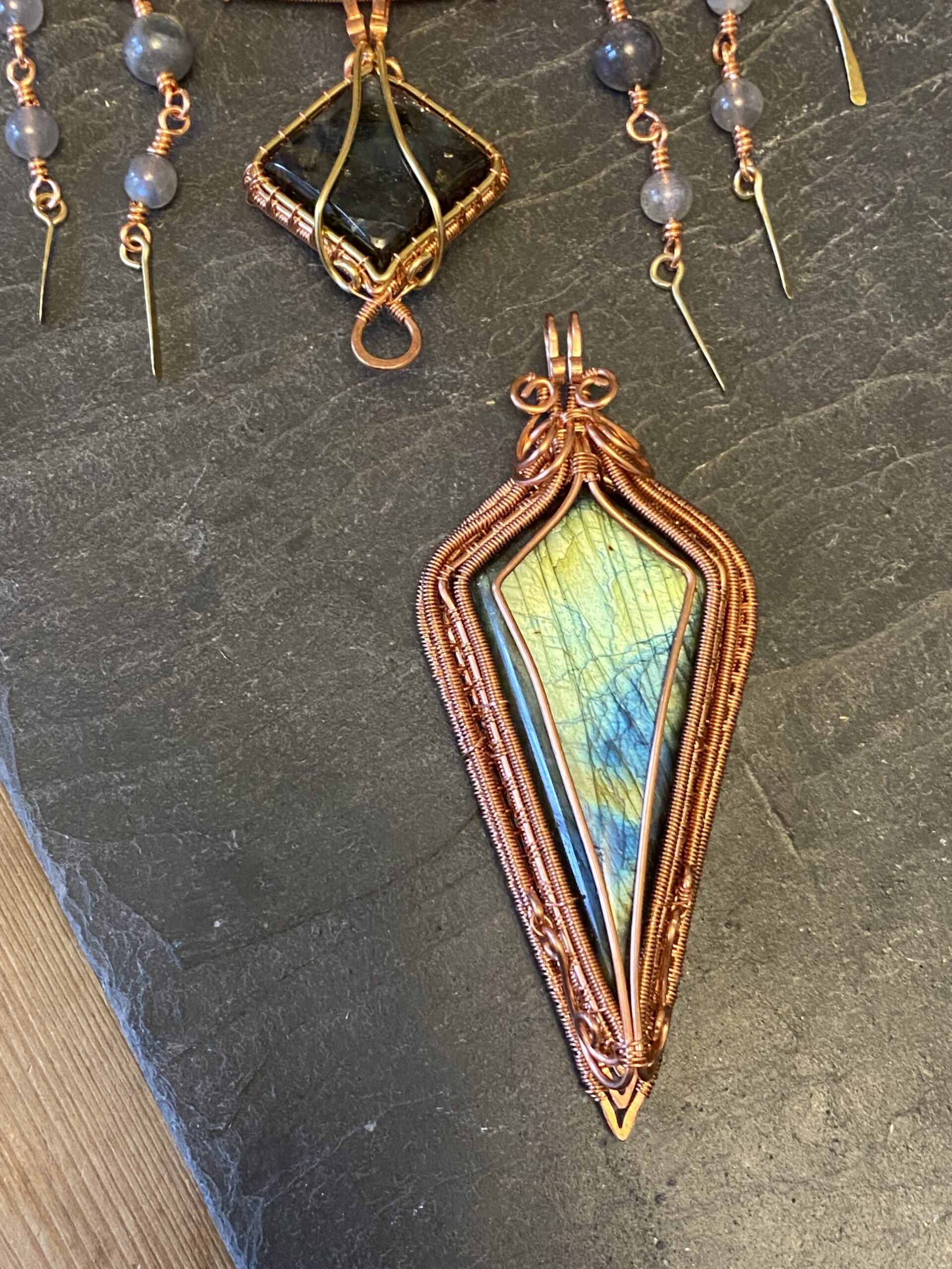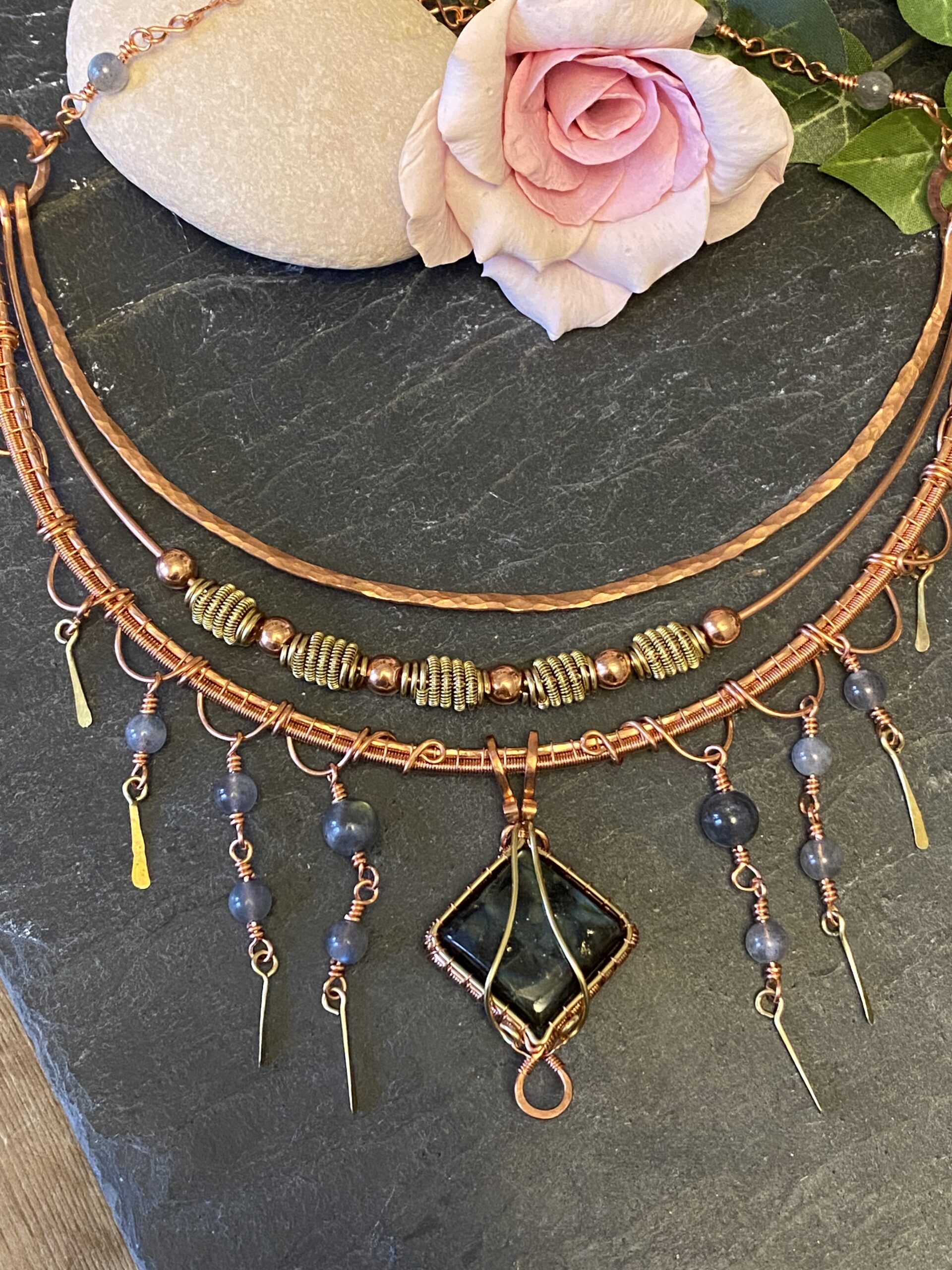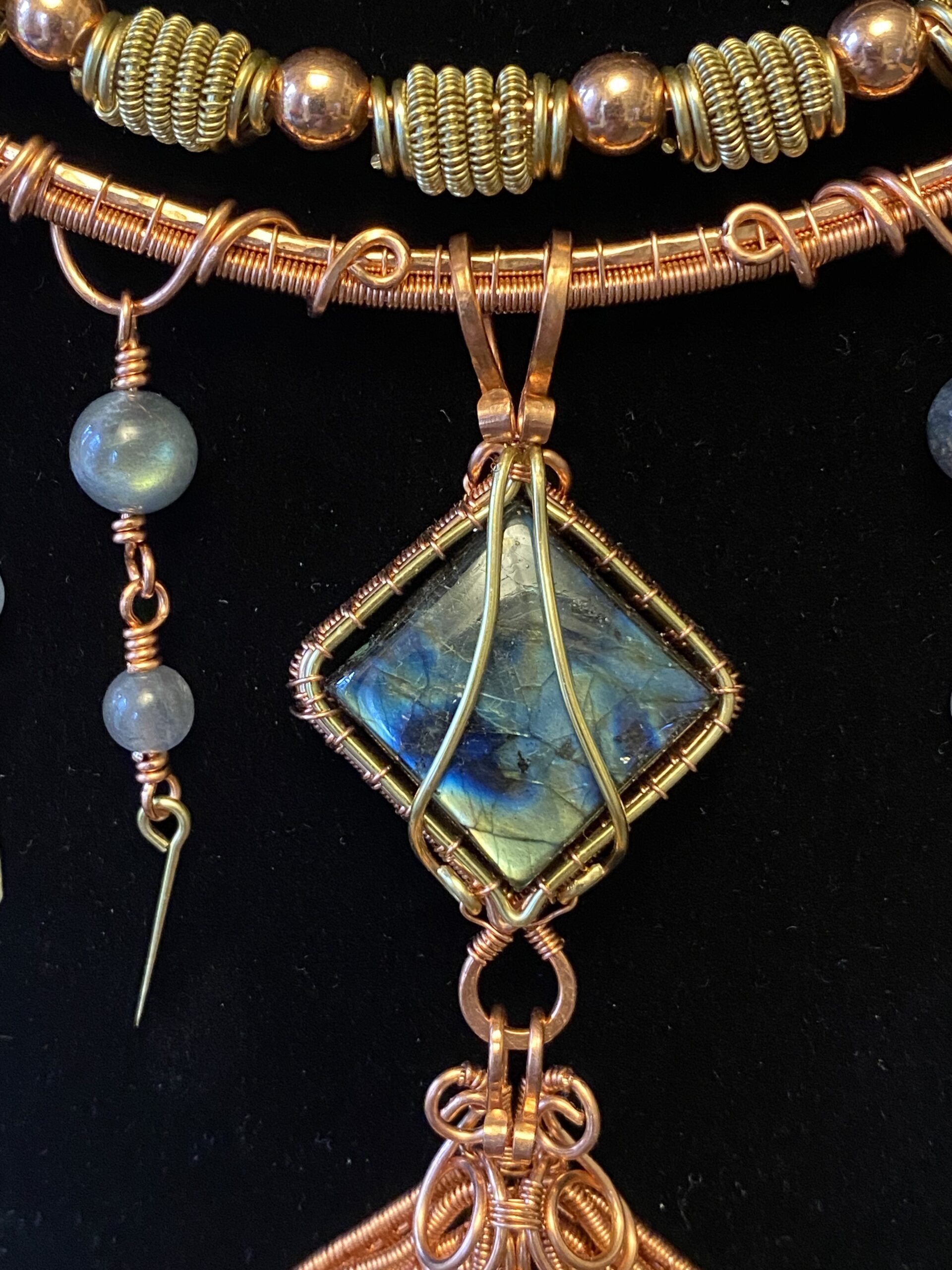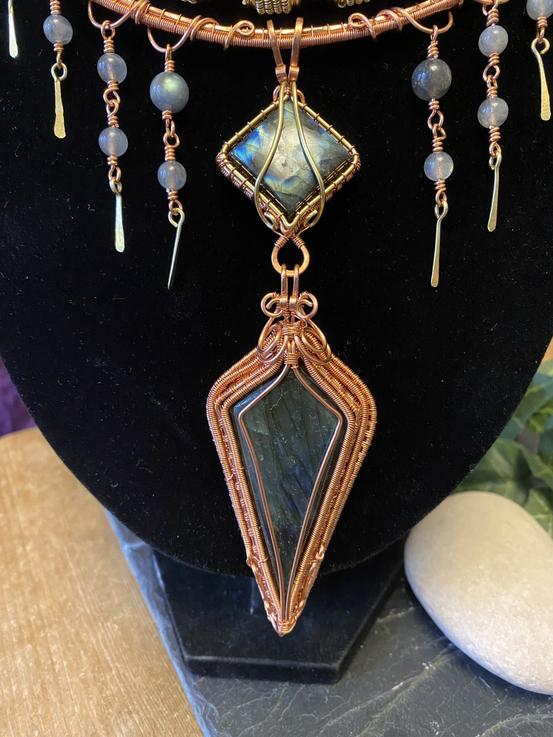 At the centre, I incorporate a detachable pendant made with two labradorite cabochons. I wrap each stone by hand using copper wire, shaping the frame to highlight the natural flash and character of the labradorite. Because labradorite changes with the light, the pendant reveals new colours as you move.