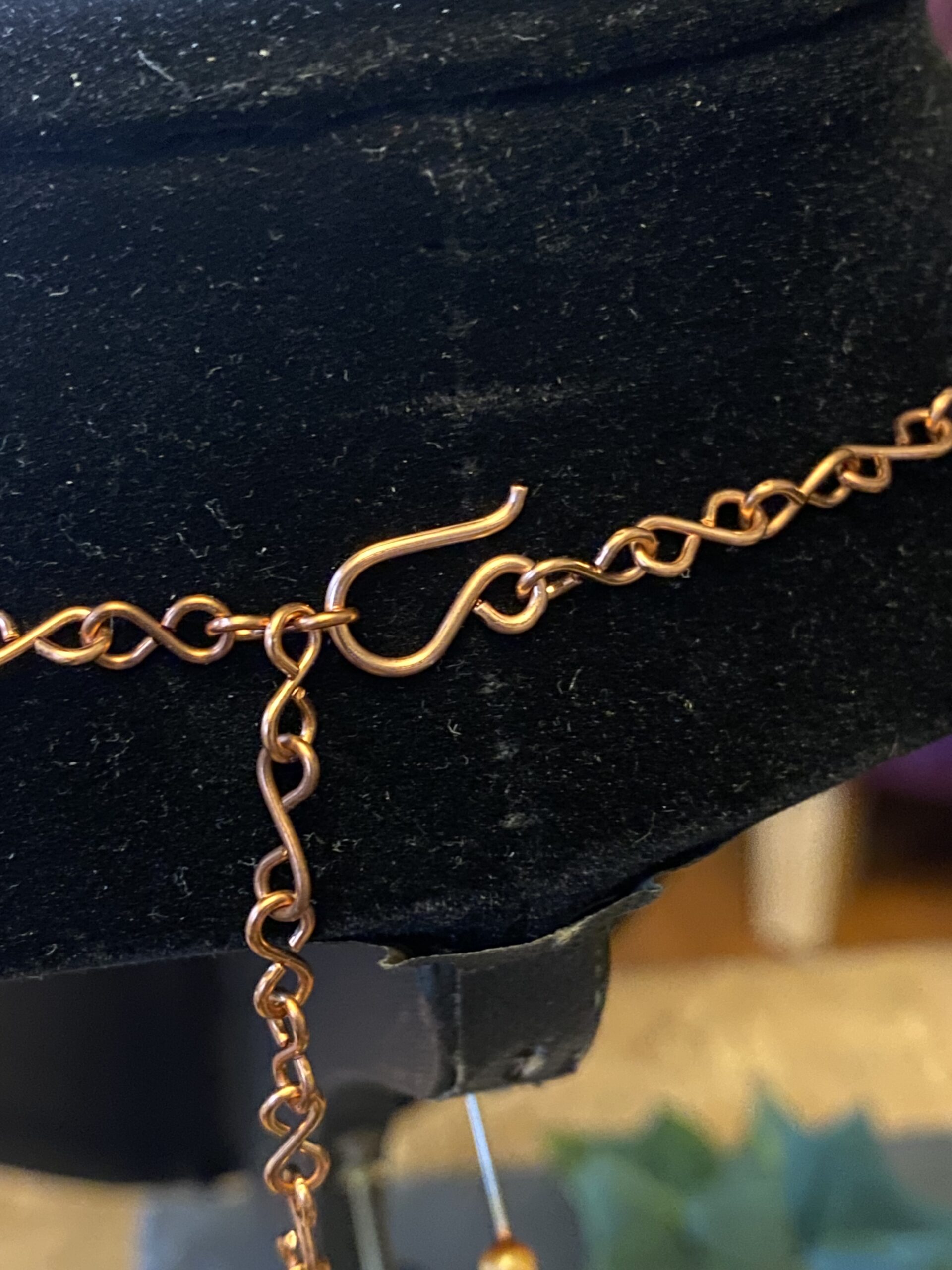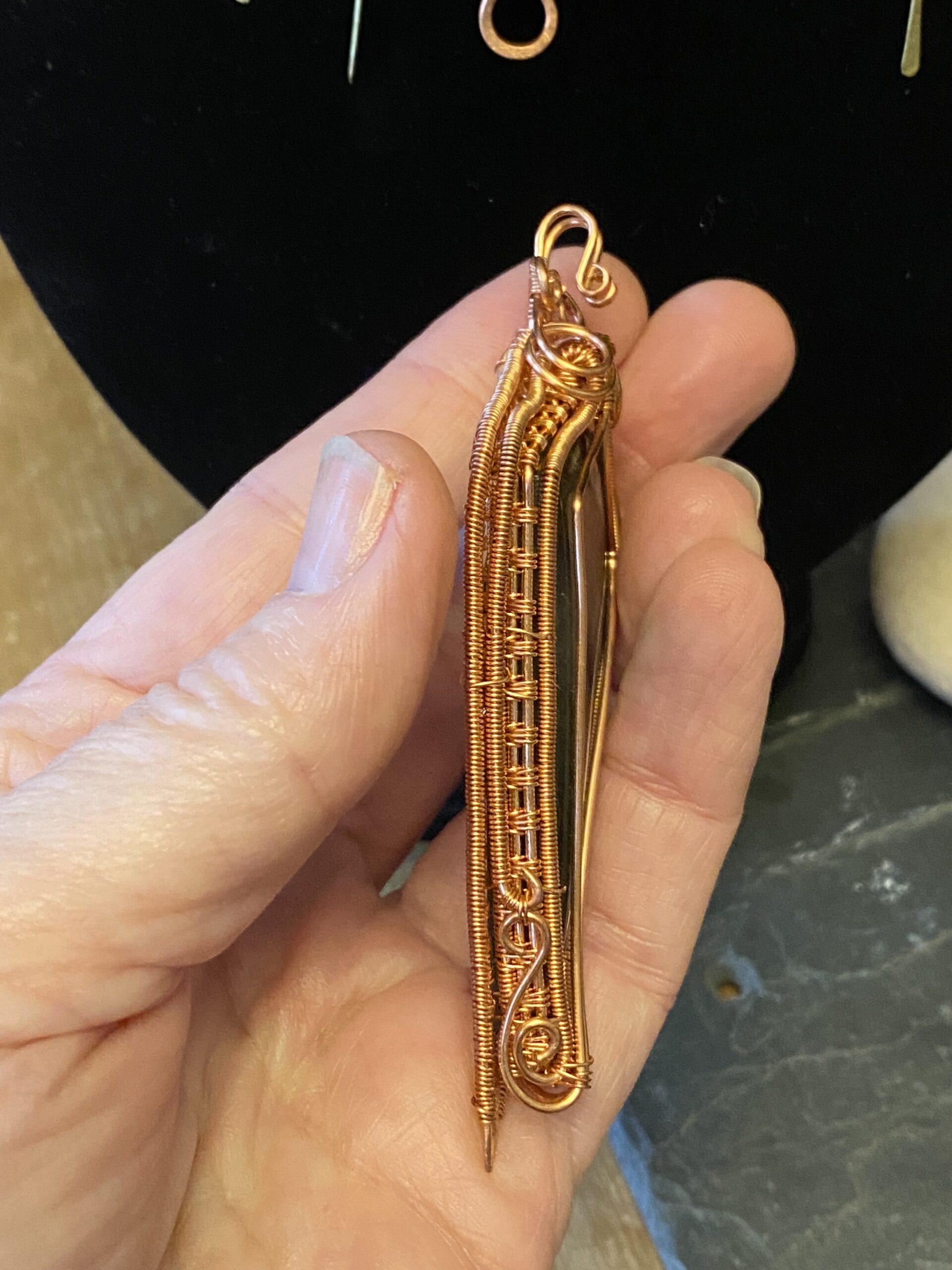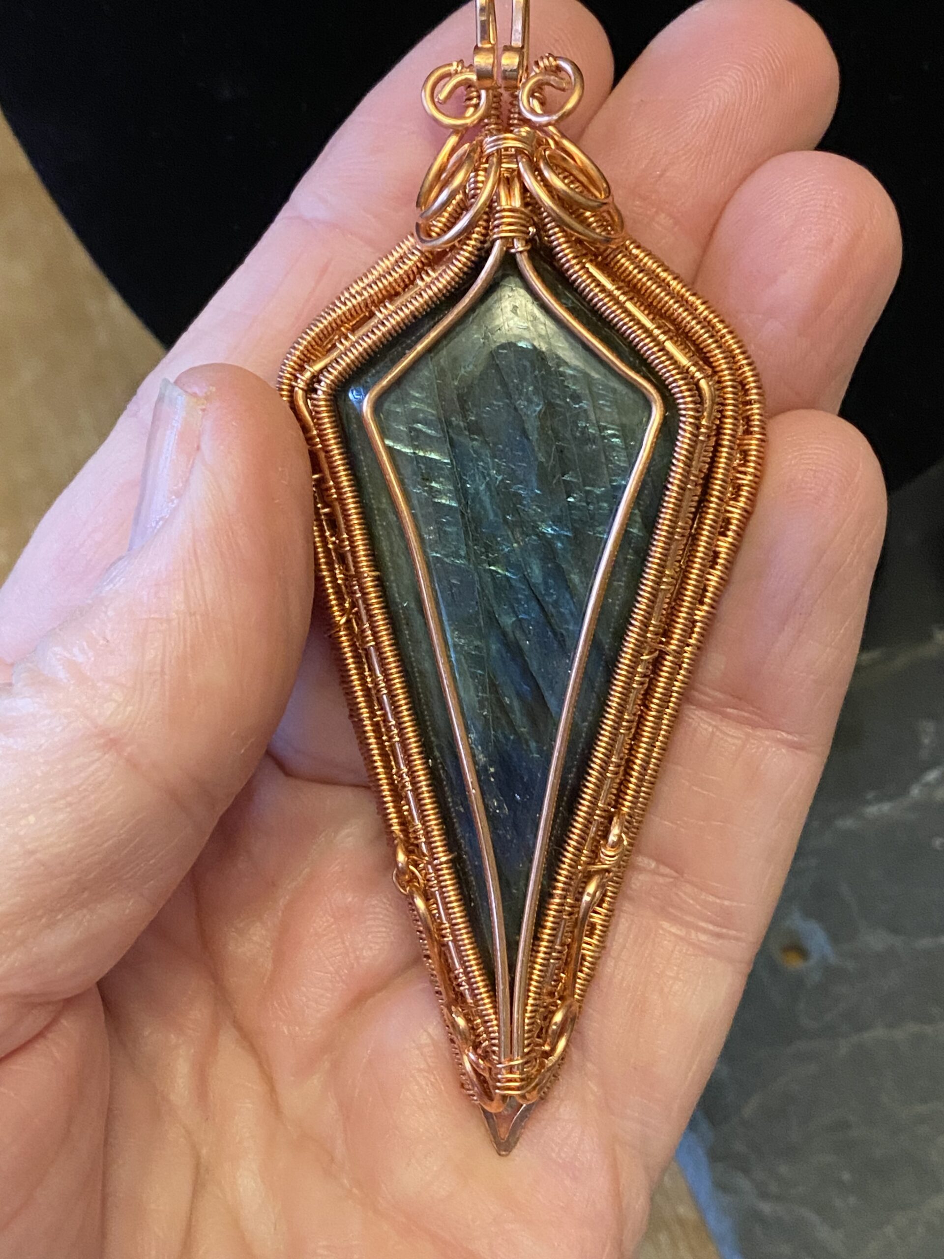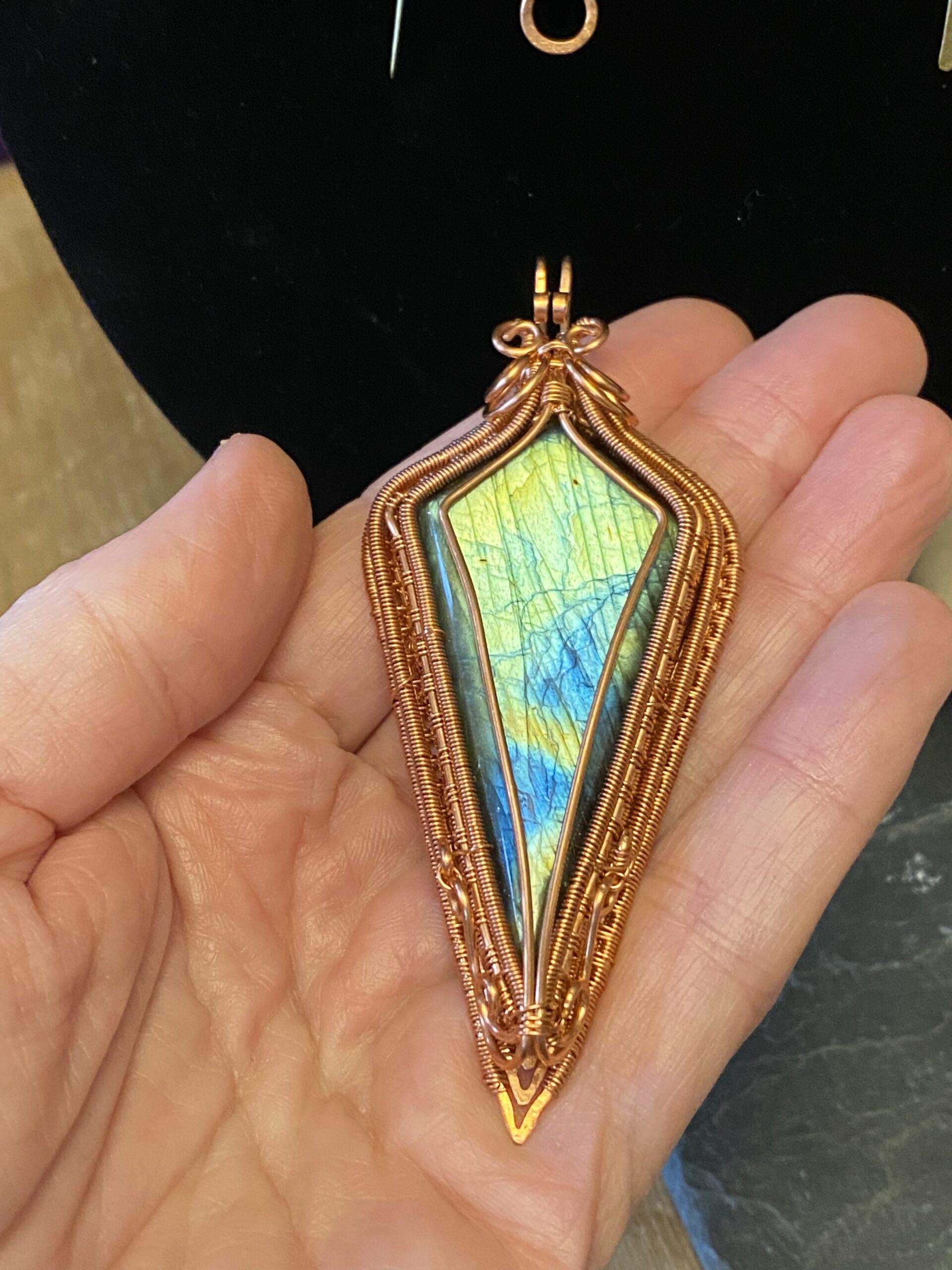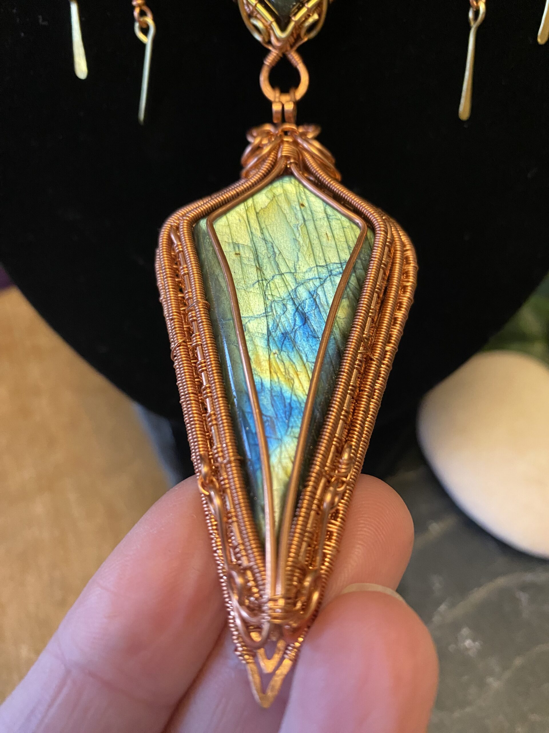 At the centre, I incorporate a detachable pendant made with two labradorite cabochons. I wrap each stone by hand using copper wire, shaping the frame to highlight the natural flash and character of the labradorite. Because labradorite changes with the light, the pendant reveals new colours as you move.