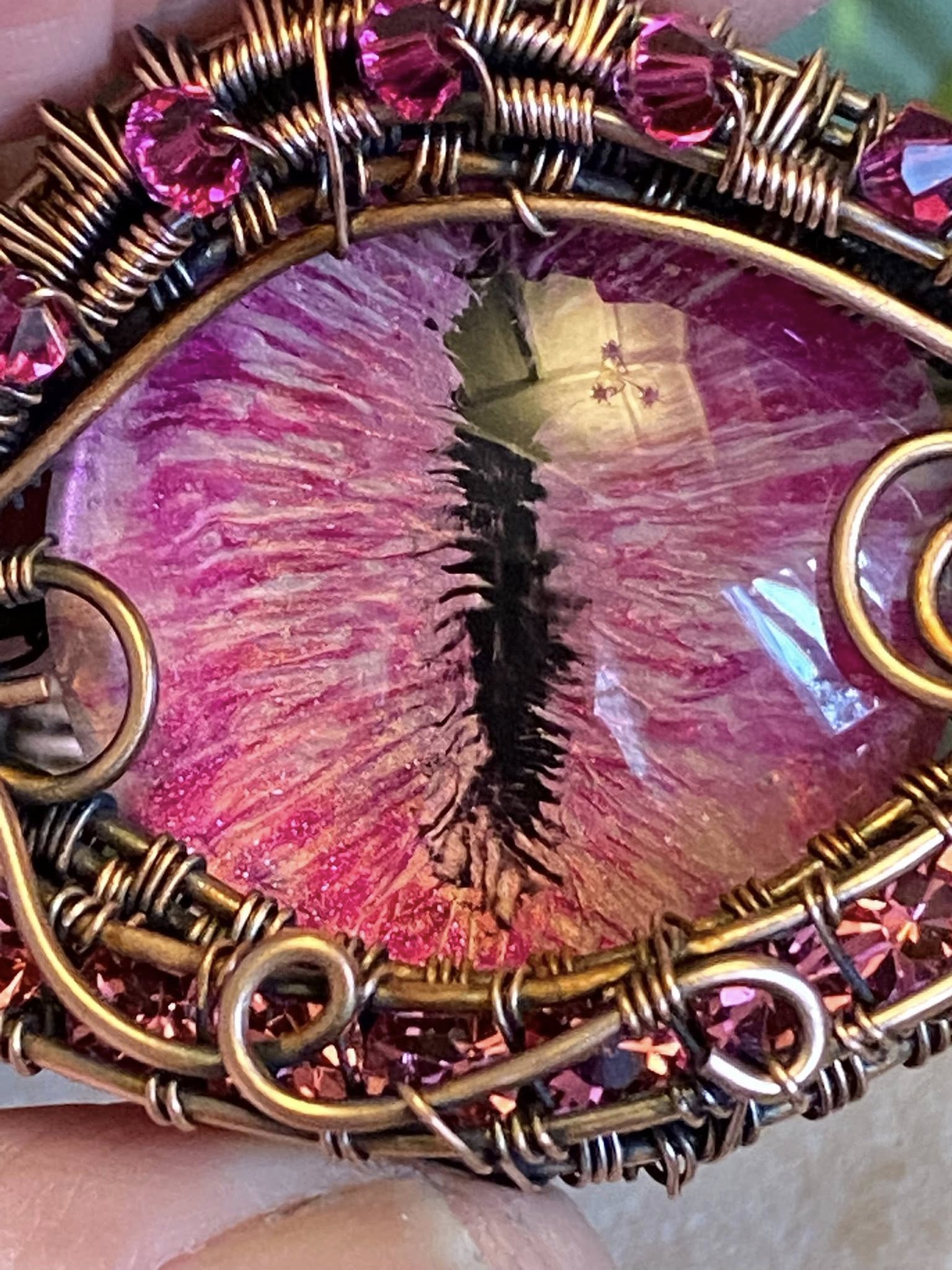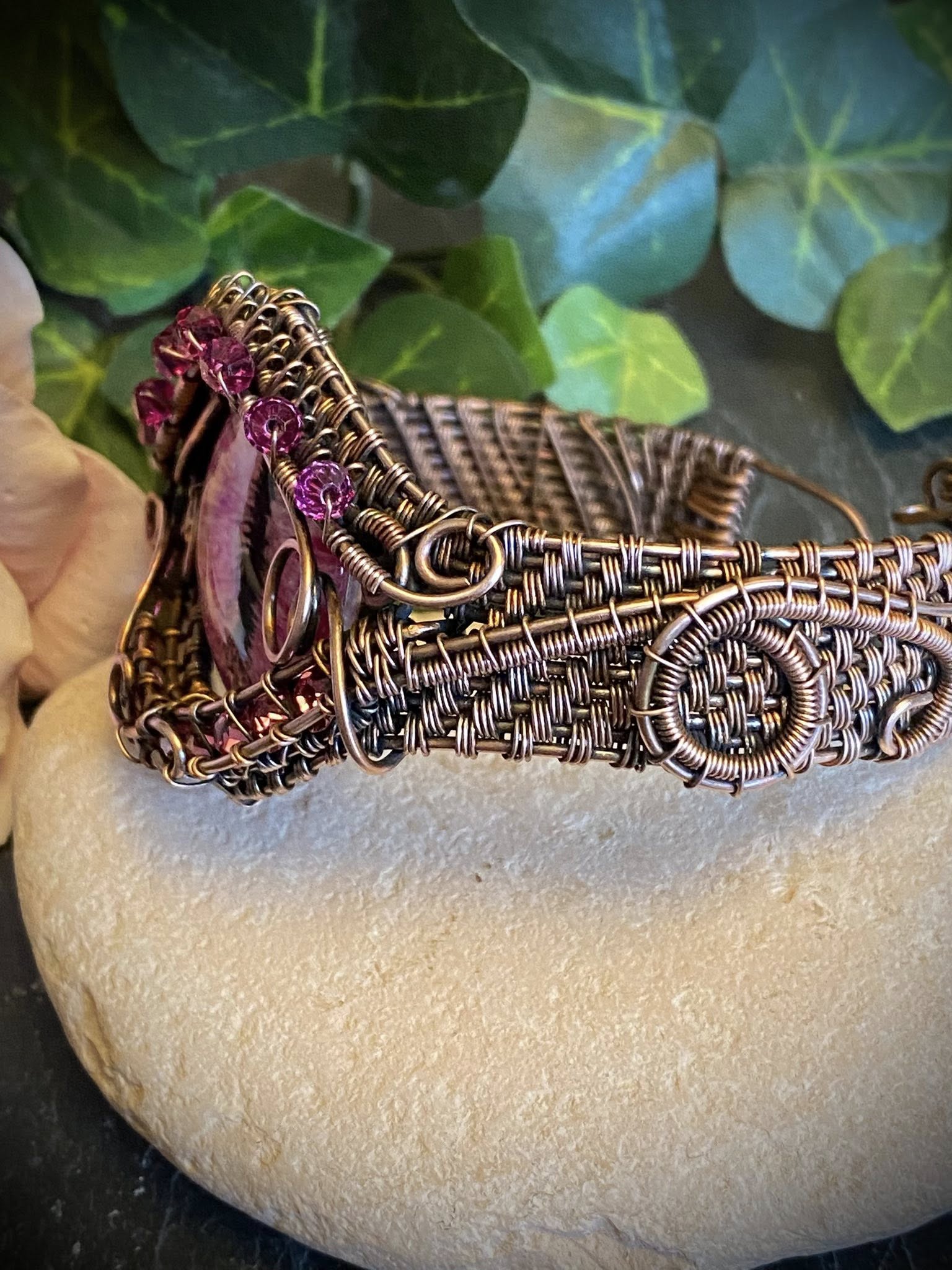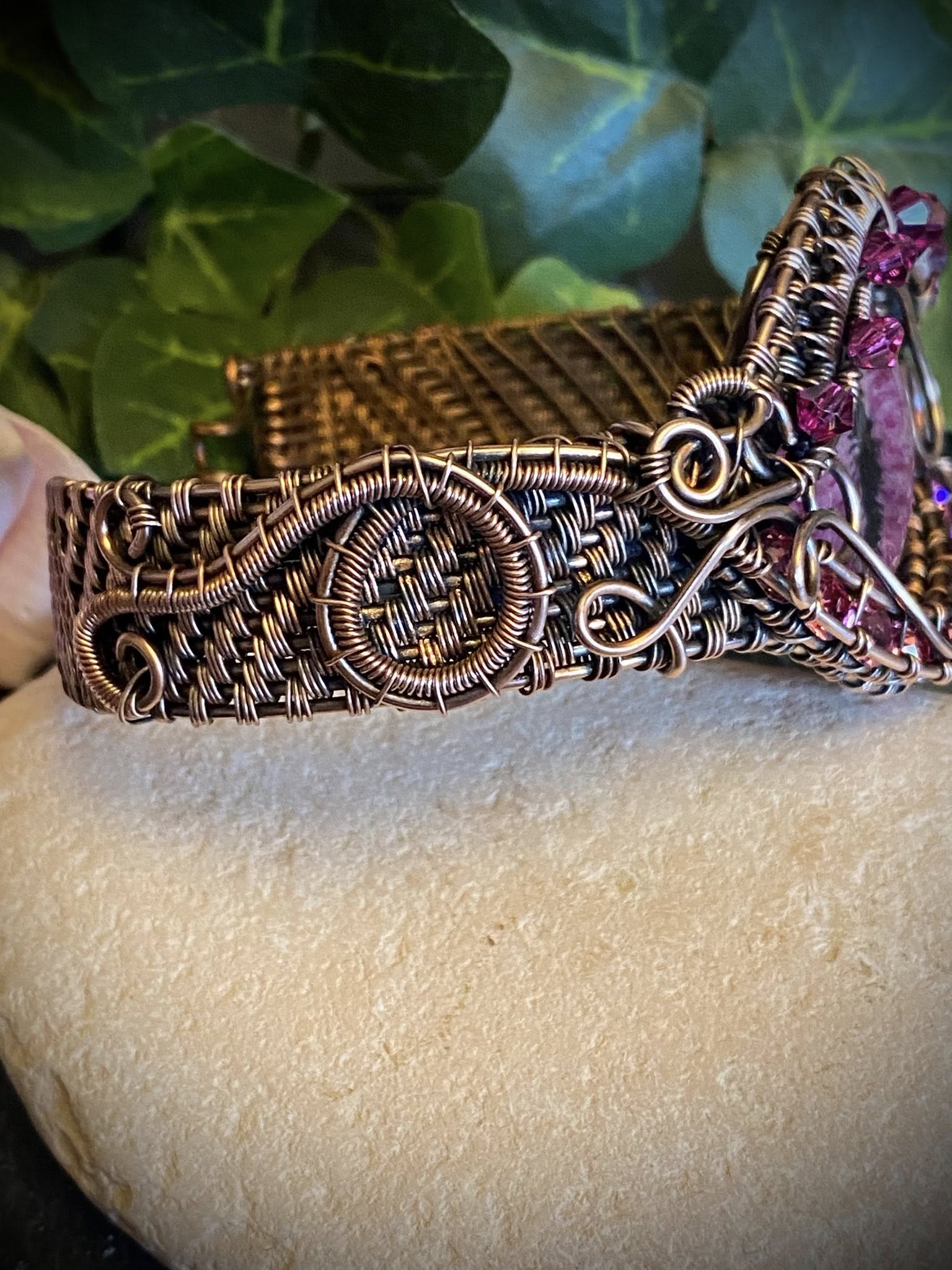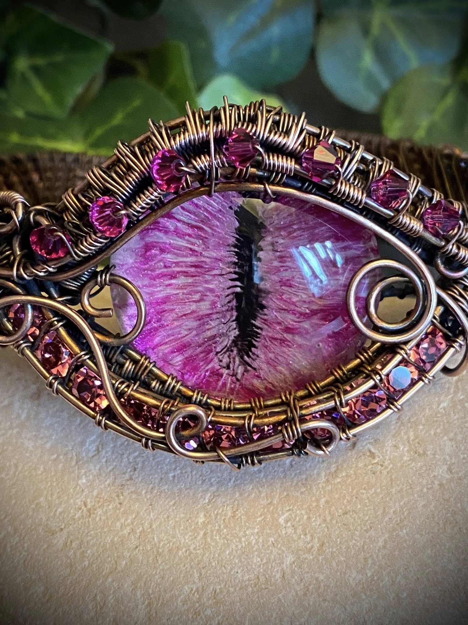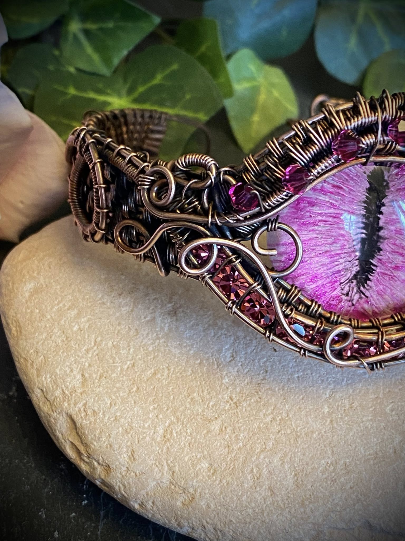 Pink Dragon Eye Copper Wire Woven Cuff Bracelet – Handcrafted Wire Wrapped Jewelry with Austrian Crystals
