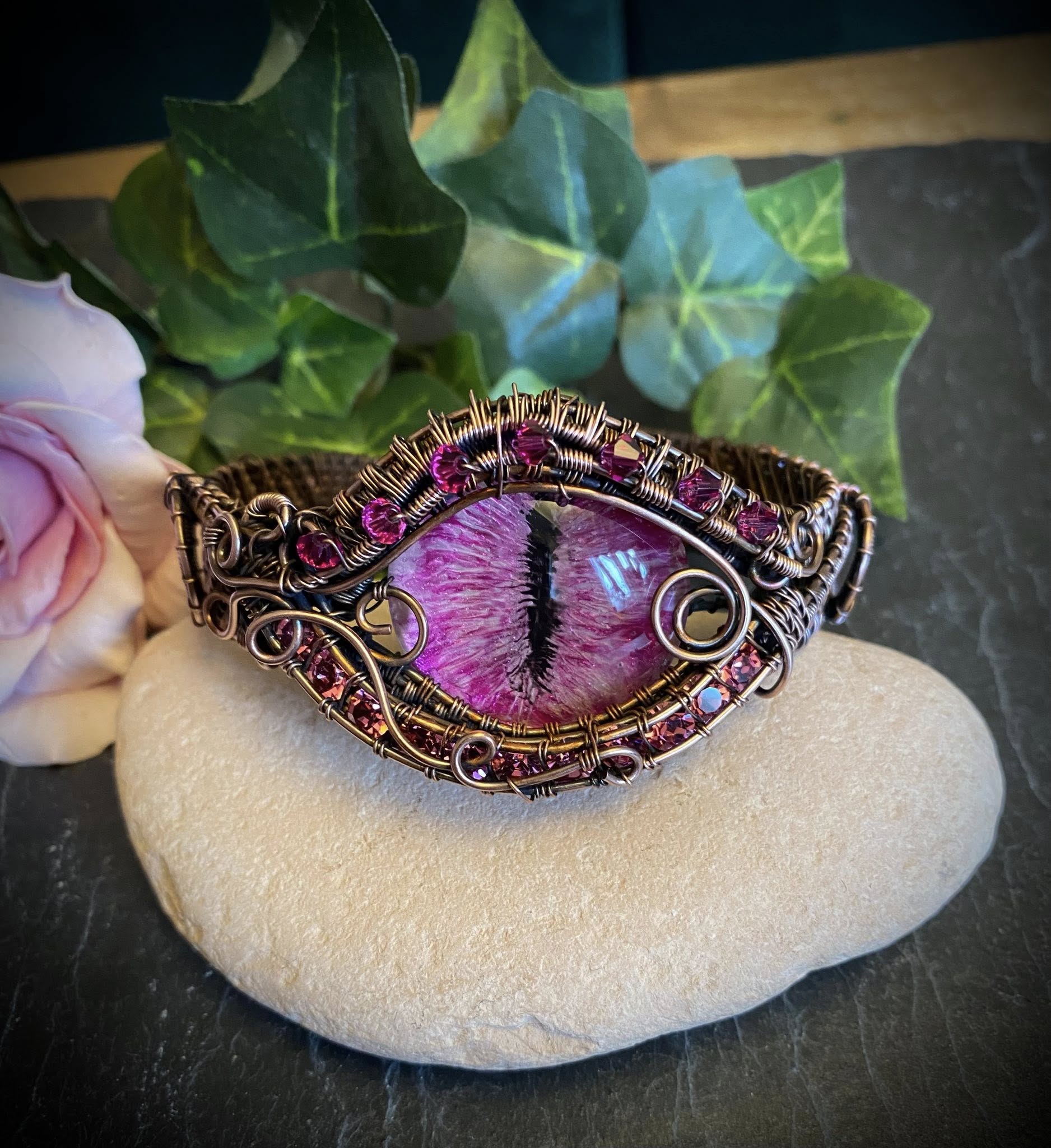Genuine Austrian crystals and matching pink beads embellish the design, creating a subtle shimmer that complements the dragon eye. Together with the warm copper tones, the bracelet exudes a magical and whimsical aesthetic, perfect for fantasy fans and jewelry lovers alike.